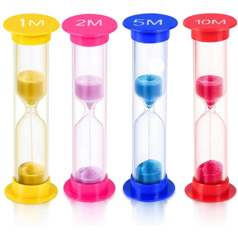Комплект содержит четыре песочных часа с разными интервалами времени, которые легко различаются по цвету: Желтый-1 минута, Розовый-2 минуты, Синий-5 минут, Красный-10 минут.