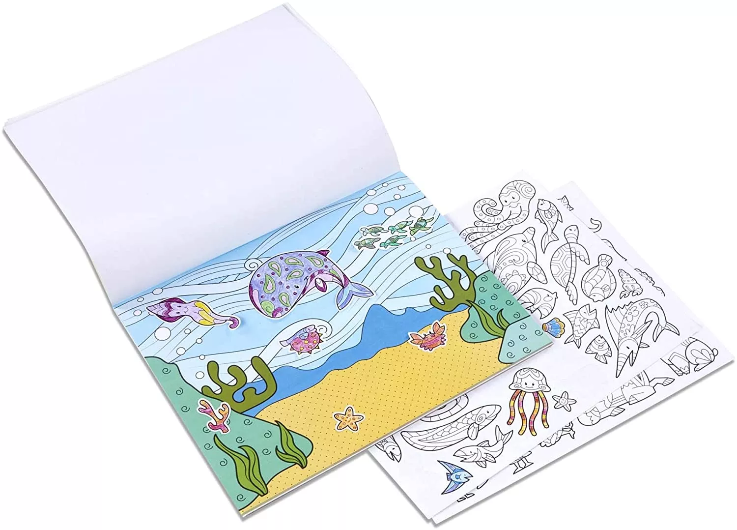 Большой набор наклеек раскрасок на долгое время увлечет ребенка. Включает 18 тематических сюжетов: ферма, синий океан, пруд, доисторический пейзаж, пышный тропический лес, лесной лес и другие. Выберите одну из шести ярких сюжетов (каждый сюжет повторяется 3 раза), выберите лист соответствующих наклеек с животными. Ребенку нужно раскрасить наклейки и сделать их уникальными. После этого, можно наклеить наклейки на лист с сюжетом. Наклейки можно раскрасить маркерами или цветными карандашами.