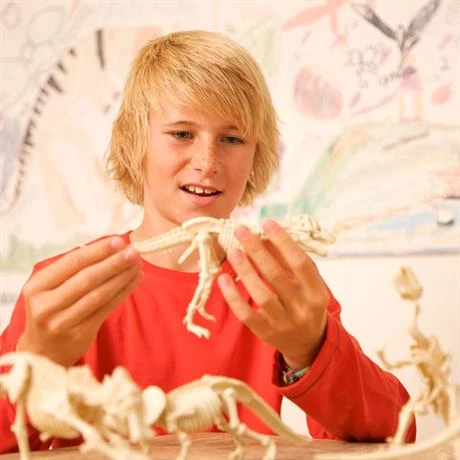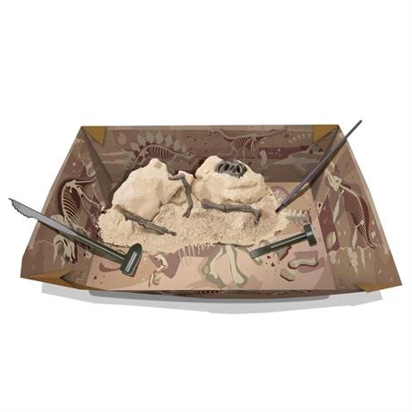Увлекательные раскопки займут от нескольких часов до нескольких дней. Чтобы ускорить процесс раскопок, можно намочить брикет. Плоской стороной скребка аккуратно счищают гипс. Когда покажутся части скелета, нужно работать инструментами аккуратнее, чтобы не повредить его. Удалить пыль можно кисточкой. Найдя все кости, дети могут собрать модель скелета, скрепив его мягким воском. Чтобы нагреть его. нужно подержать в ладошках. Когда воск застынет - скрепит скелет динозавра.