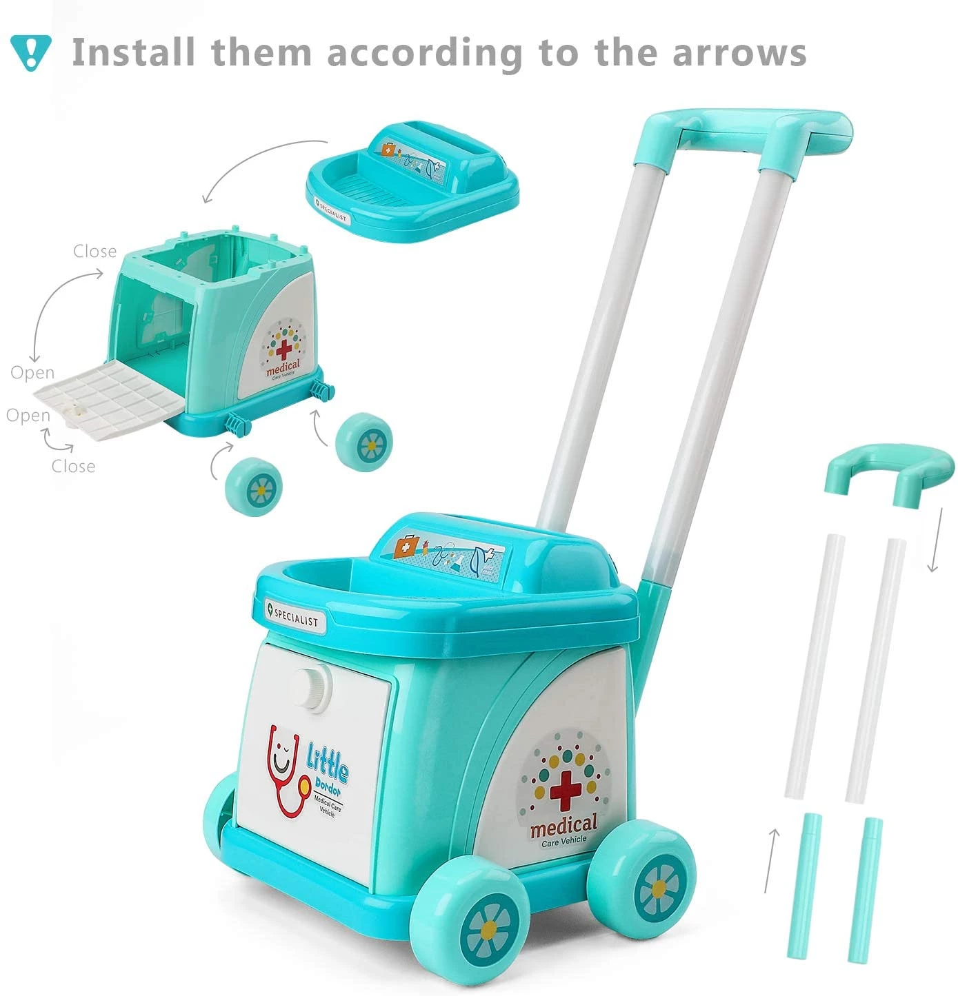 Все медицинские принадлежности можно положить в тележку. Не беспокойтесь о хранении. И удобно, что эта тележка может быть медицинской тележкой. Ребенок может получить базовые медицинские знания, играя с аптечкой.