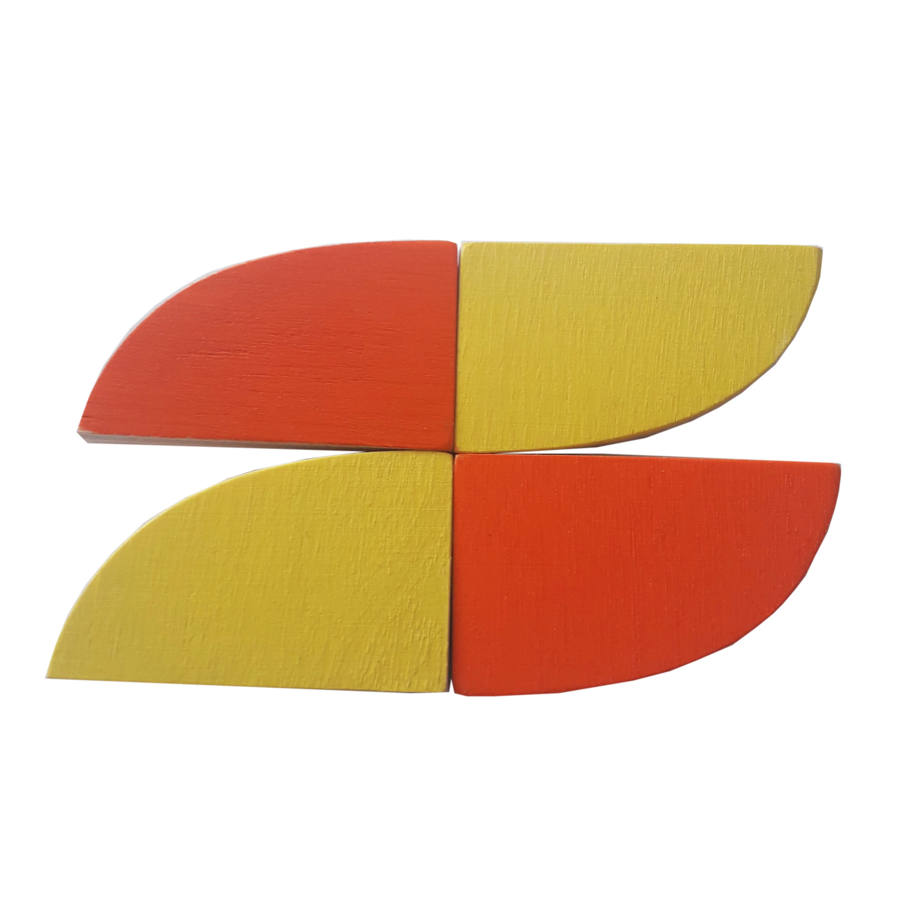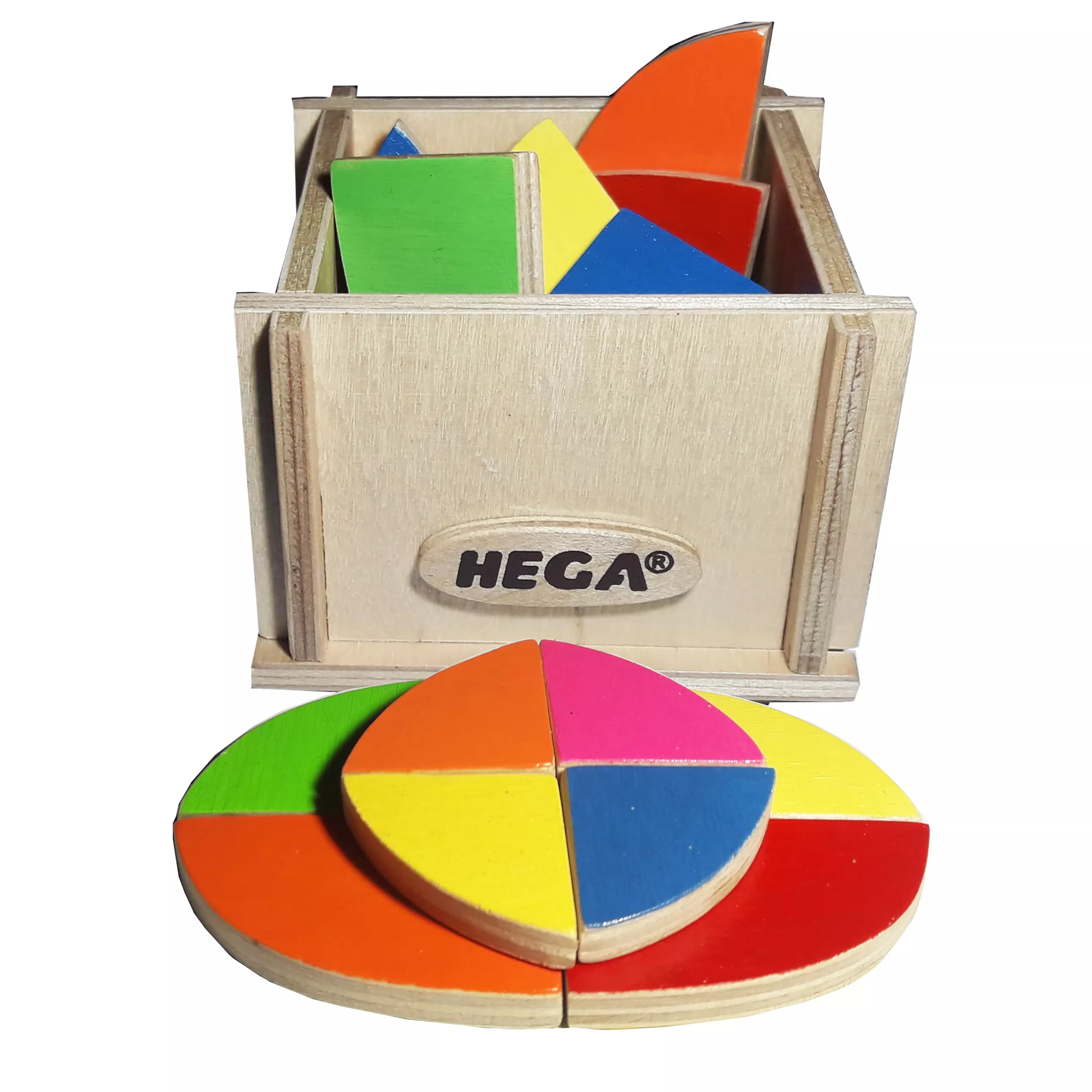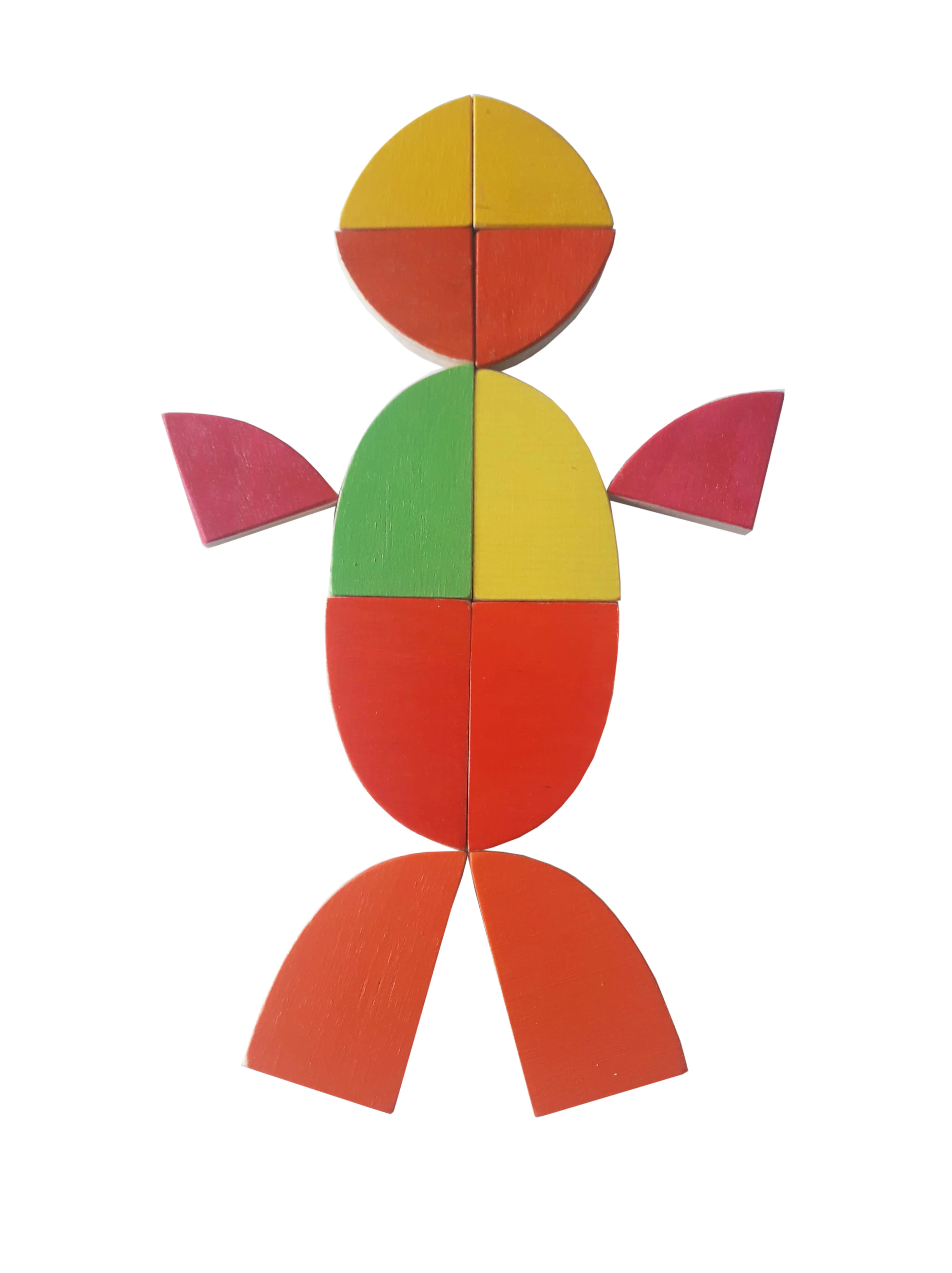 Фигуры выполнены из натуральной древесины и окрашены нетоксичными красками на водной основе. Изделия представлены в 4 цветах: синем, желтом, красном, зеленом. Каждая фигура окрашена в разные цвета на лицевой и обратной стороне. Это первая детская головоломка, способствующая развитию мелкой моторики, координации движений и внимания.