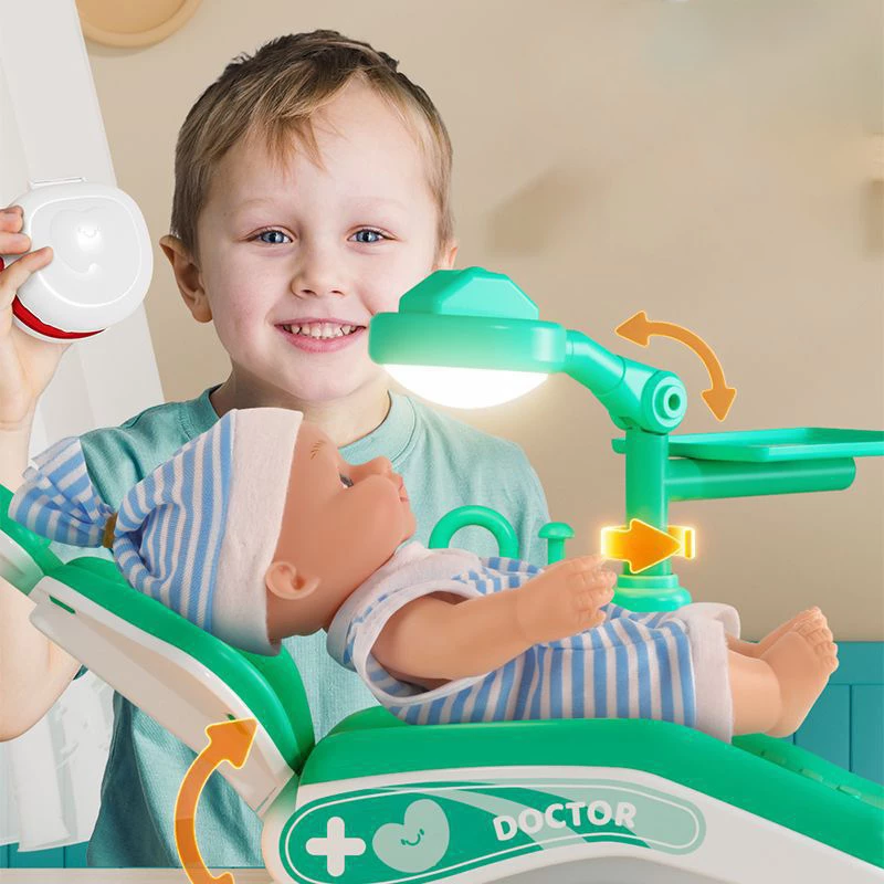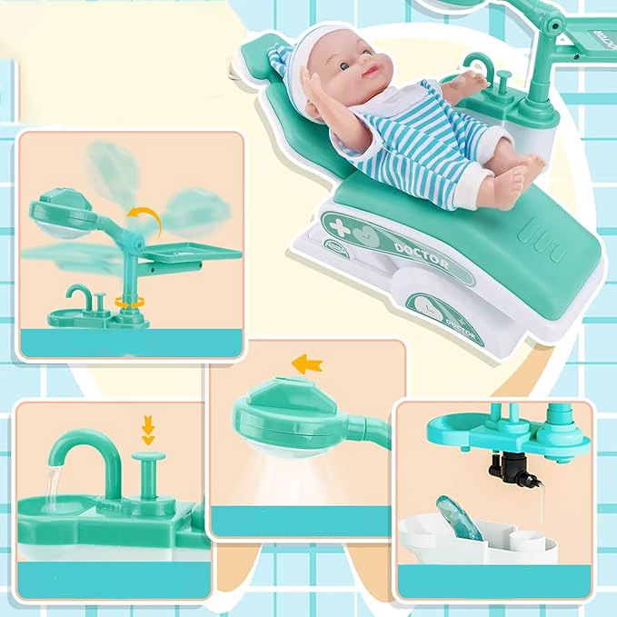 Каждому ребенку понравится играть и притвориться маленьким дантистом! Стетоскоп при нажатии воспроизводит реалистичные звуковые эффекты сердцебиения, водопроводный кран может откачивать воду, есть выключатель света на кресле, можно сжимать тюбик с игровой зубной пастой.