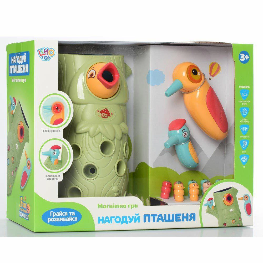 Эта веселая игра придется по вкусу и мальчикам, и девочкам. Сначала ребенок должен вставить червячков в специальные отверстия в дереве. Потом он берет в руку птичку и при помощи ее магнитного клюва извлекает червячков из дерева, чтобы накормить ими птенца.