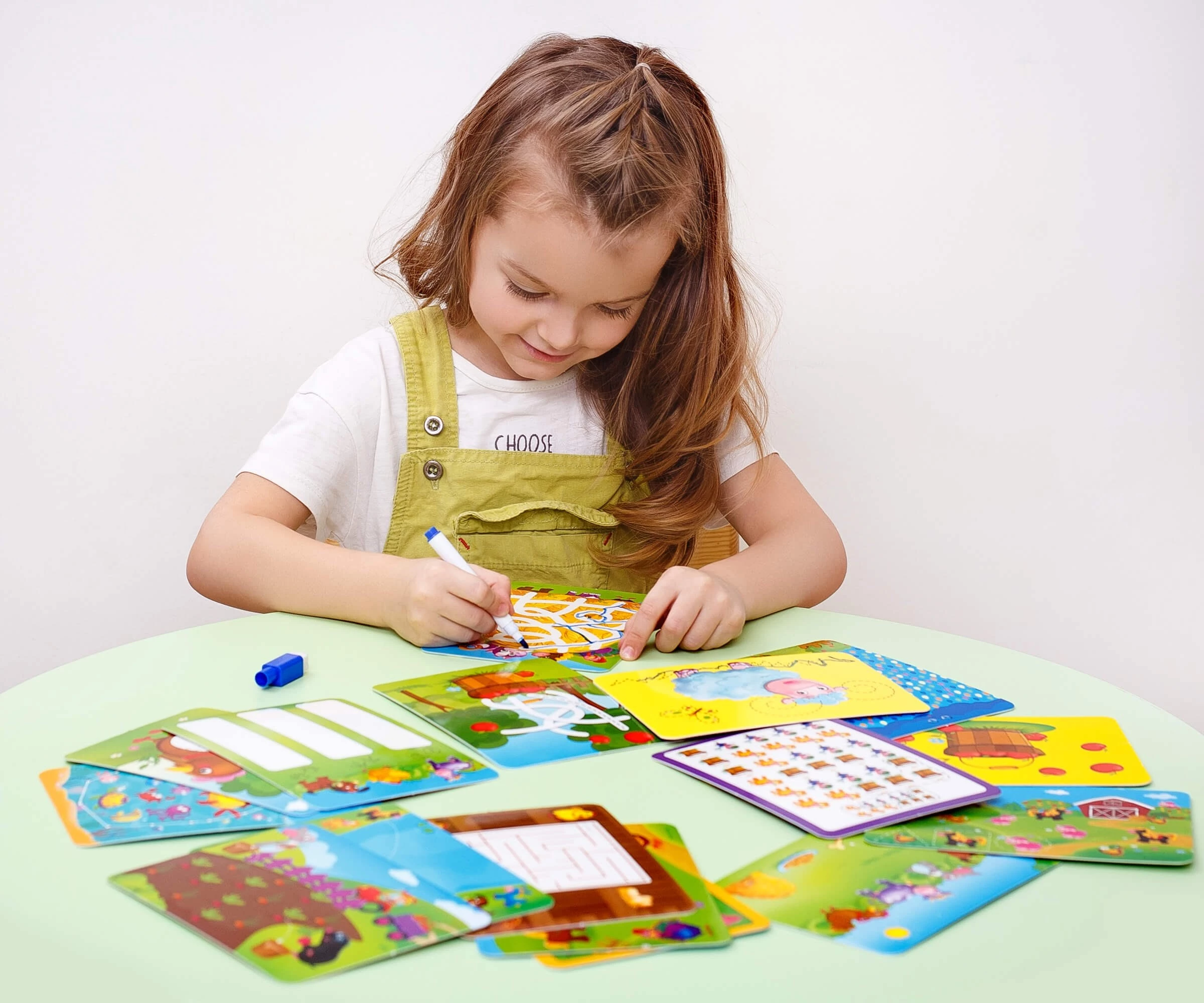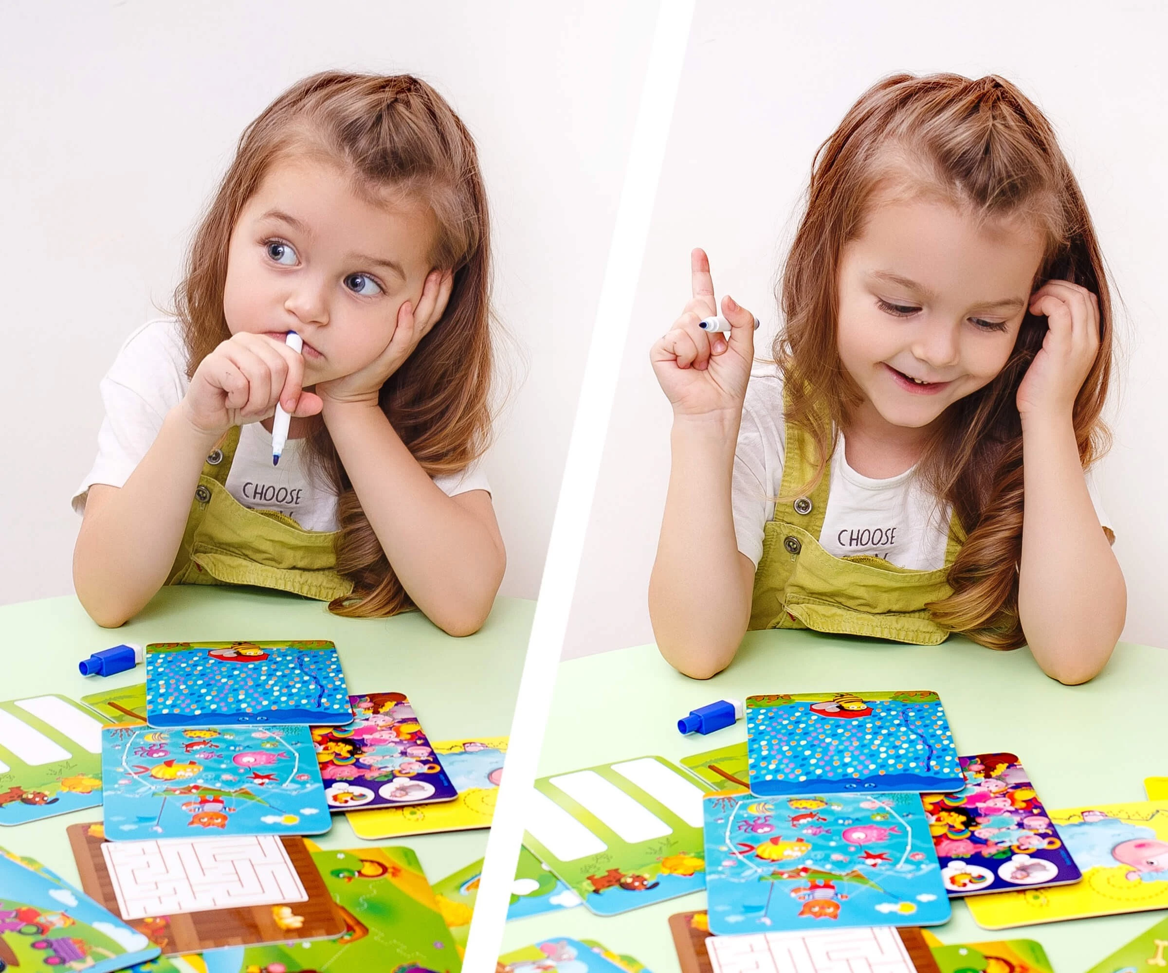 Выберите карточку. Внимательно изучите ее и выполните задание, воспользовавшись входящим в набор маркером. Потом можно стереть маркер губкой и написать снова. Например: помогите собачке выбраться из лабиринта и попасть домой. Если вы перепутали путь, просто сотрите неправильный маршрут и попробуйте еще раз.