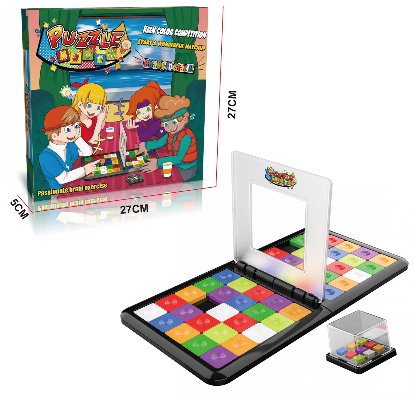 Правила игры: Каждый игрок получает игровое поле и кубик шейкер с примером. Необходимо потрясти кубик, для того, чтобы изображение на нем поменялось. Игроки должны в центре игрового поле повторить расположение цветов, выпавшее на поле. Победителем становится тот, кто справился раньше соперника