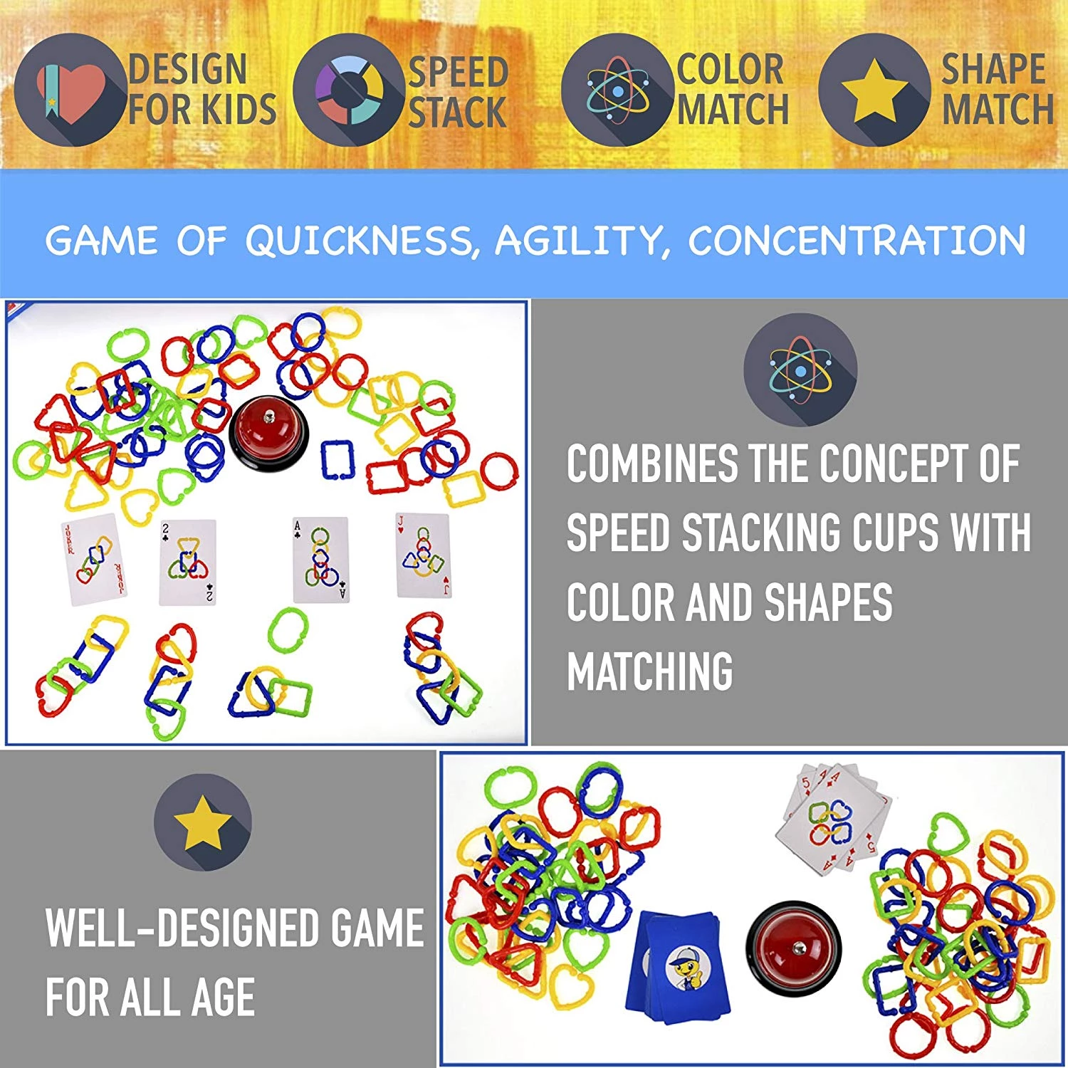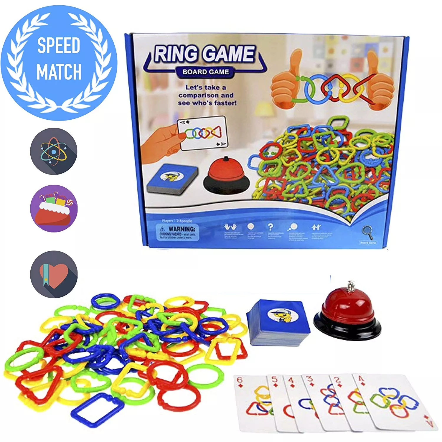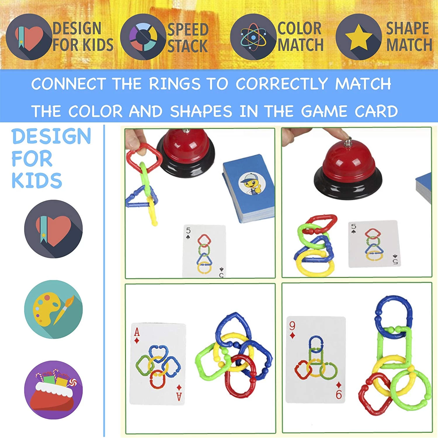 СКОРОСТЬ, ВНИМАНИЕ, ЦВЕТА: Цветная цепочка - это веселая игра, которая сочетает в себе концепцию быстро сбора цепочки как на карточке. Соедините кольца, чтобы правильно совпадало с цветом и фигурами в игровых карточках, нажимайте на звоночек, и вы заработаете карточку. Игрок с наибольшим количеством карт - победитель!