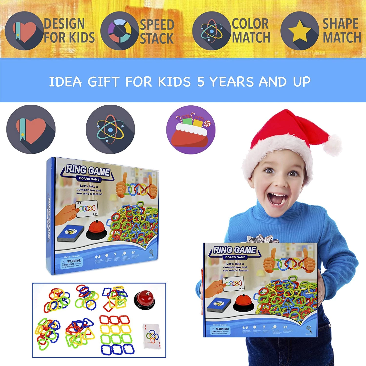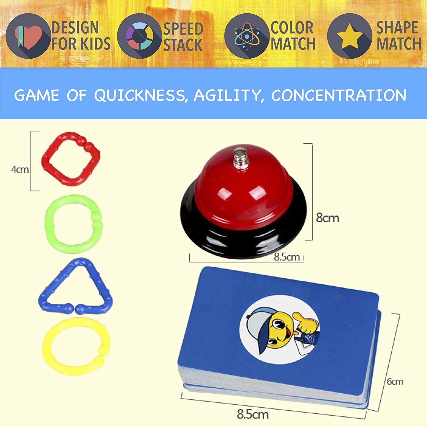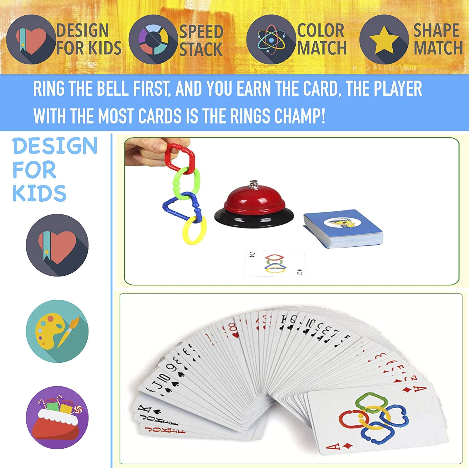 СКОРОСТЬ, ВНИМАНИЕ, ЦВЕТА: Цветная цепочка - это веселая игра, которая сочетает в себе концепцию быстро сбора цепочки как на карточке. Соедините кольца, чтобы правильно совпадало с цветом и фигурами в игровых карточках, нажимайте на звоночек, и вы заработаете карточку. Игрок с наибольшим количеством карт - победитель!
