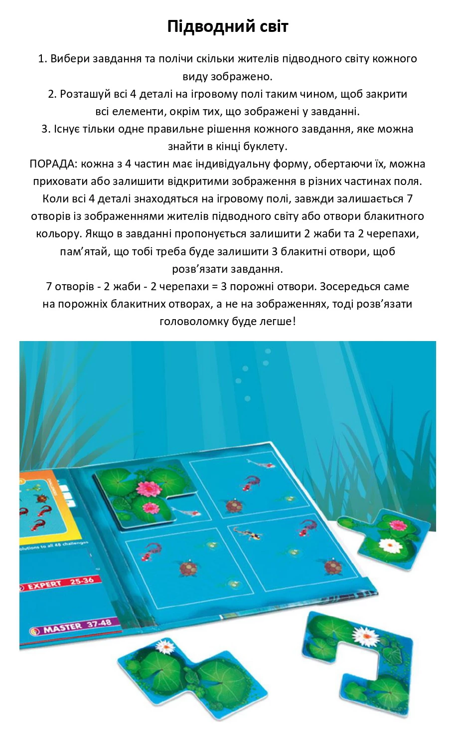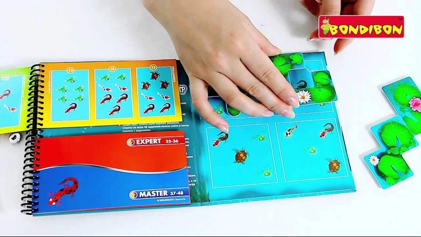 Красочная магнитная игра с рыбками, лягушками, кувшинками. Игру удобно брать в путешествие, она на долго увлечет ребенка. Отличная возможность решать логические задачи. Начать игру стоит с простых задач, чтобы попрактиковаться в поиске правильного решения. 4 магнитные детали имеют квадратную форму с окошками. Именно в этих окошках нужно оставить существ, изображенных в задании. Помните, что есть только одно правильное решение каждой задачи. И для решения задачи нужно включить логику, наблюдение и внимательность!
