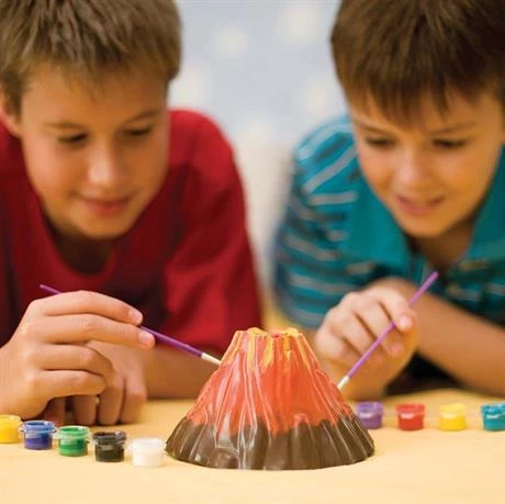 Чтобы краска ложилась ровно, нужно дождаться полного высыхания гипсового макета вулкана. Обычно это занимает не более 24 часов. Для раскраски подойдут коричневые и красные цвета, но можно проявить фантазию и выбрать другие цвета. В инструкции есть советы по смешиванию красок. С ними, ребенок сможет получить новые оттенки.