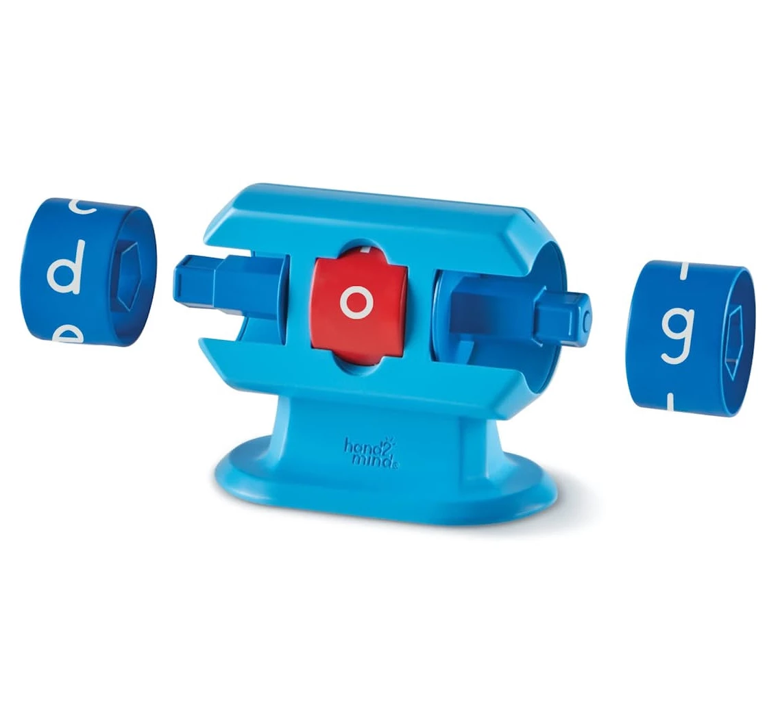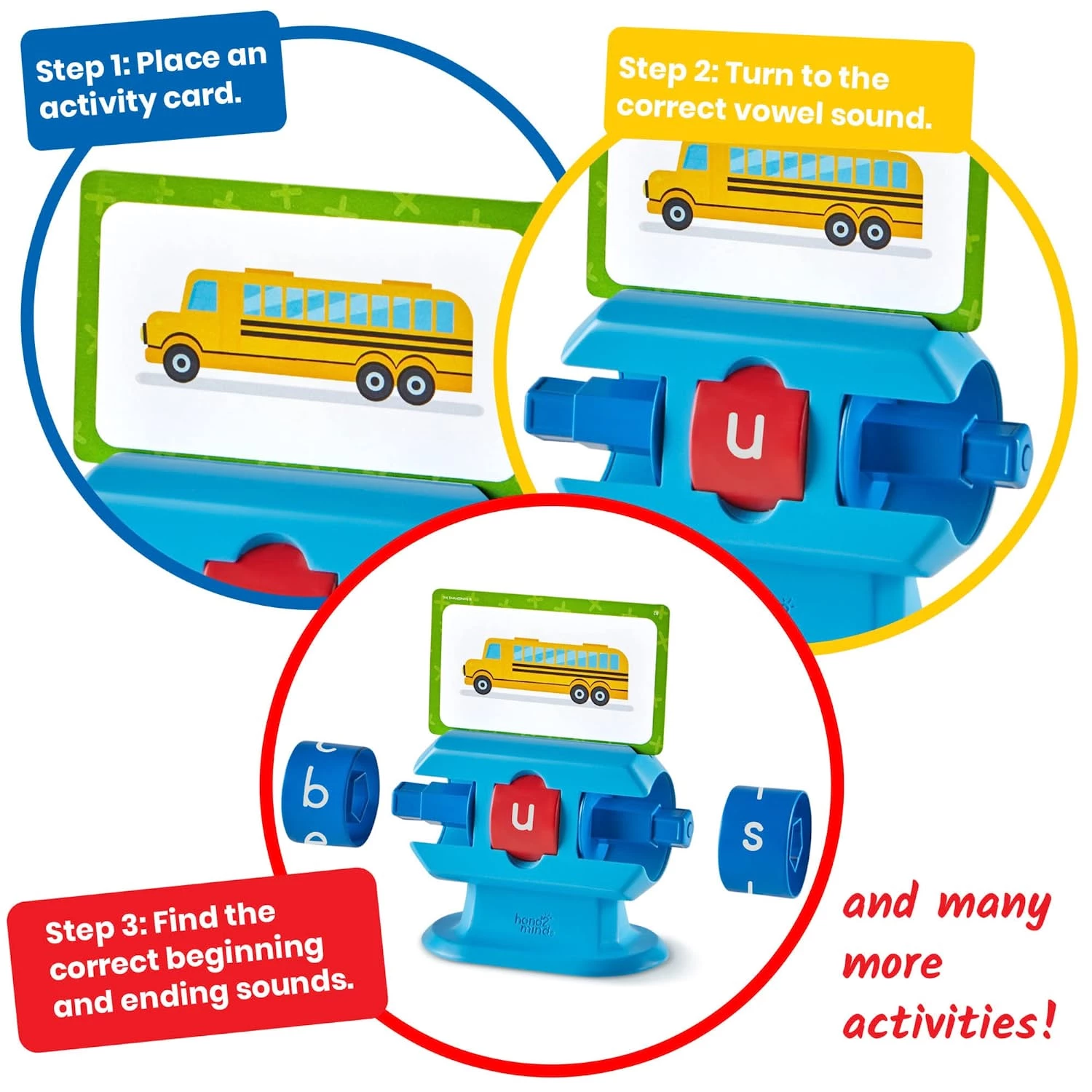 Практикуйтесь в построении слов, вращая кольца с гласными и согласными, чтобы получить комбинацию, соответствующую карточке с изображением или карточкам с упражнениями.