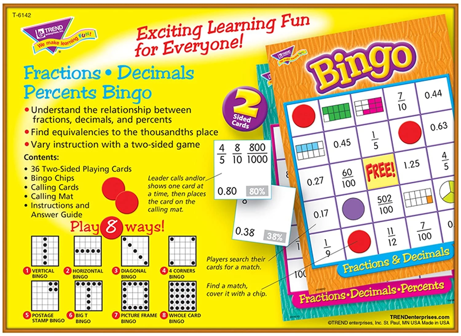 Практикуйтесь в изучении стандартных и десятичных дробей, процентов и улучшайте свои математические способности! В игровой форме материал запоминается проще, а обучение проходит веселее! Правила, как и для обычного бинго, однако, вместо привычных чисел будет новый материал.