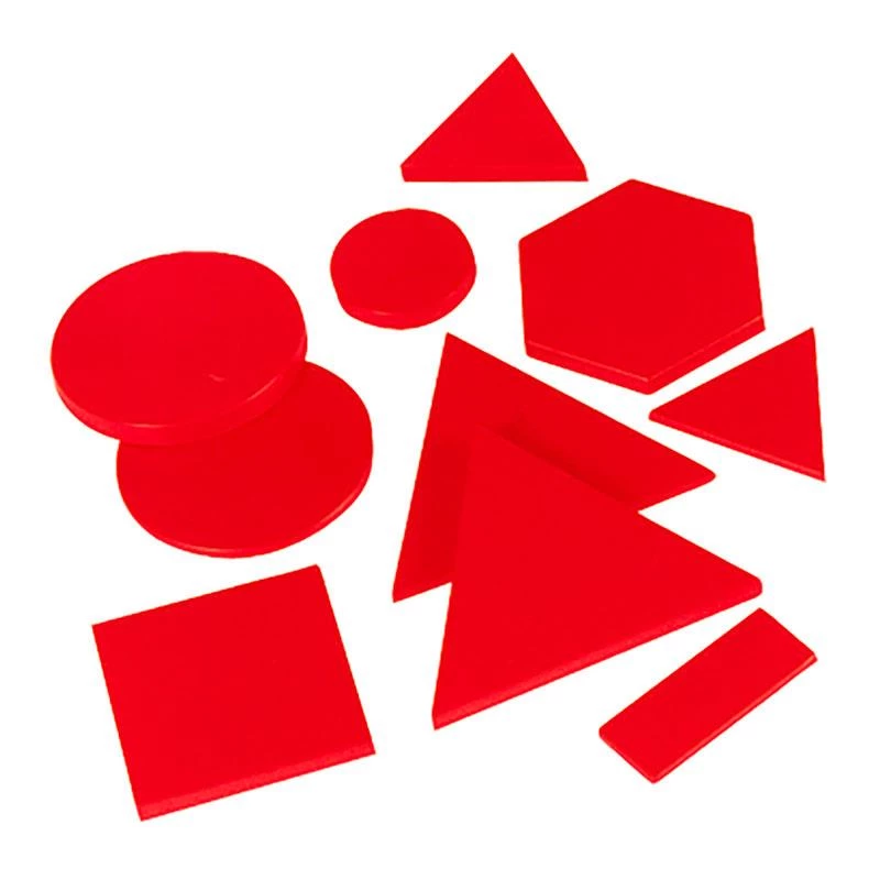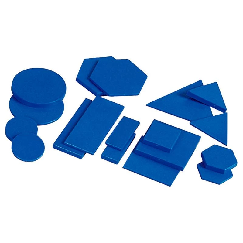 Учебно-методические пособие для занятий с геометрическими фигурами и формой предметов. В наборе 5 разных фигур: квадрат, прямоугольник, круг, треугольник, шестиугольник. Фигуры в трех цветах: красный, желтый, синий.