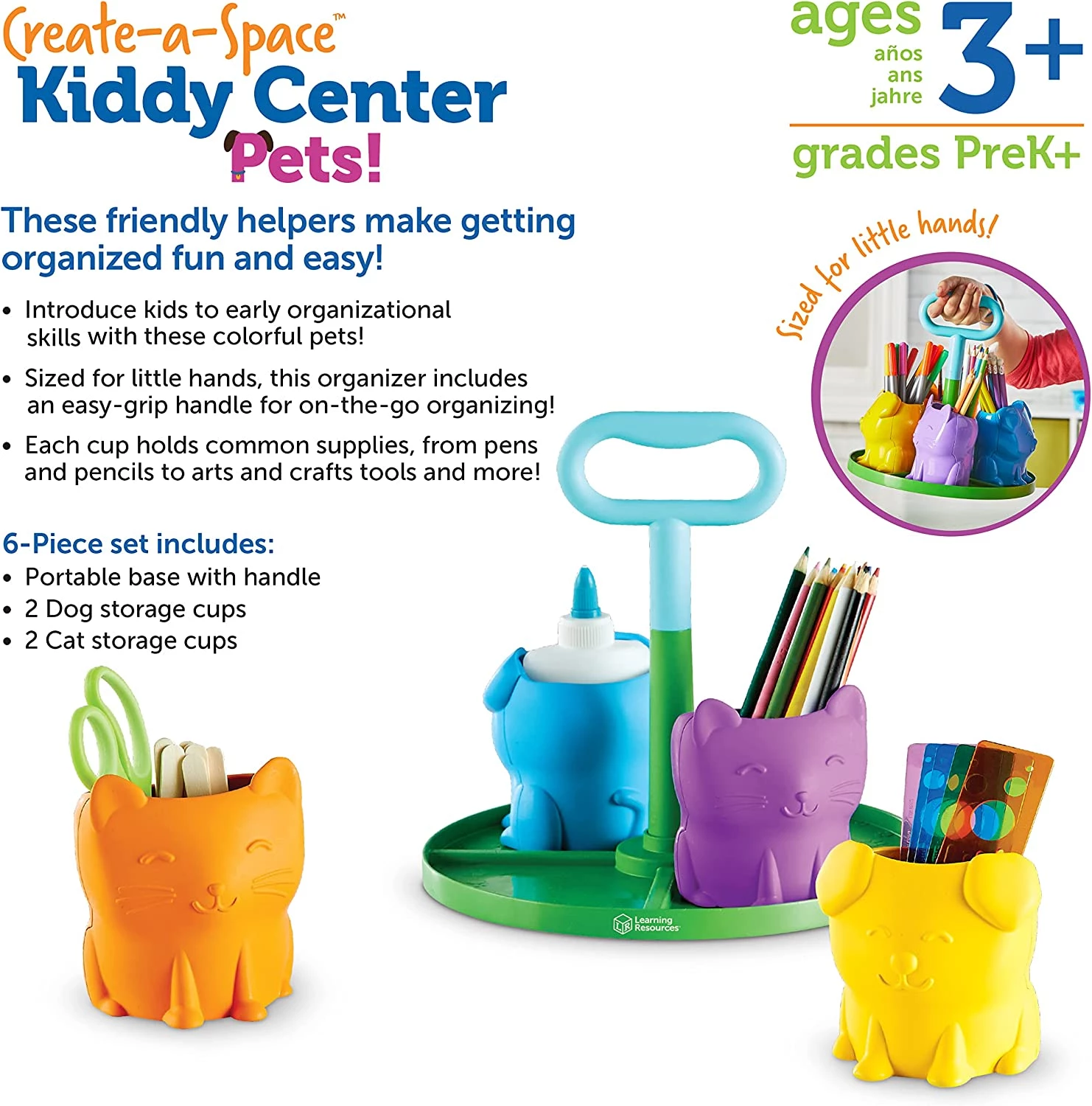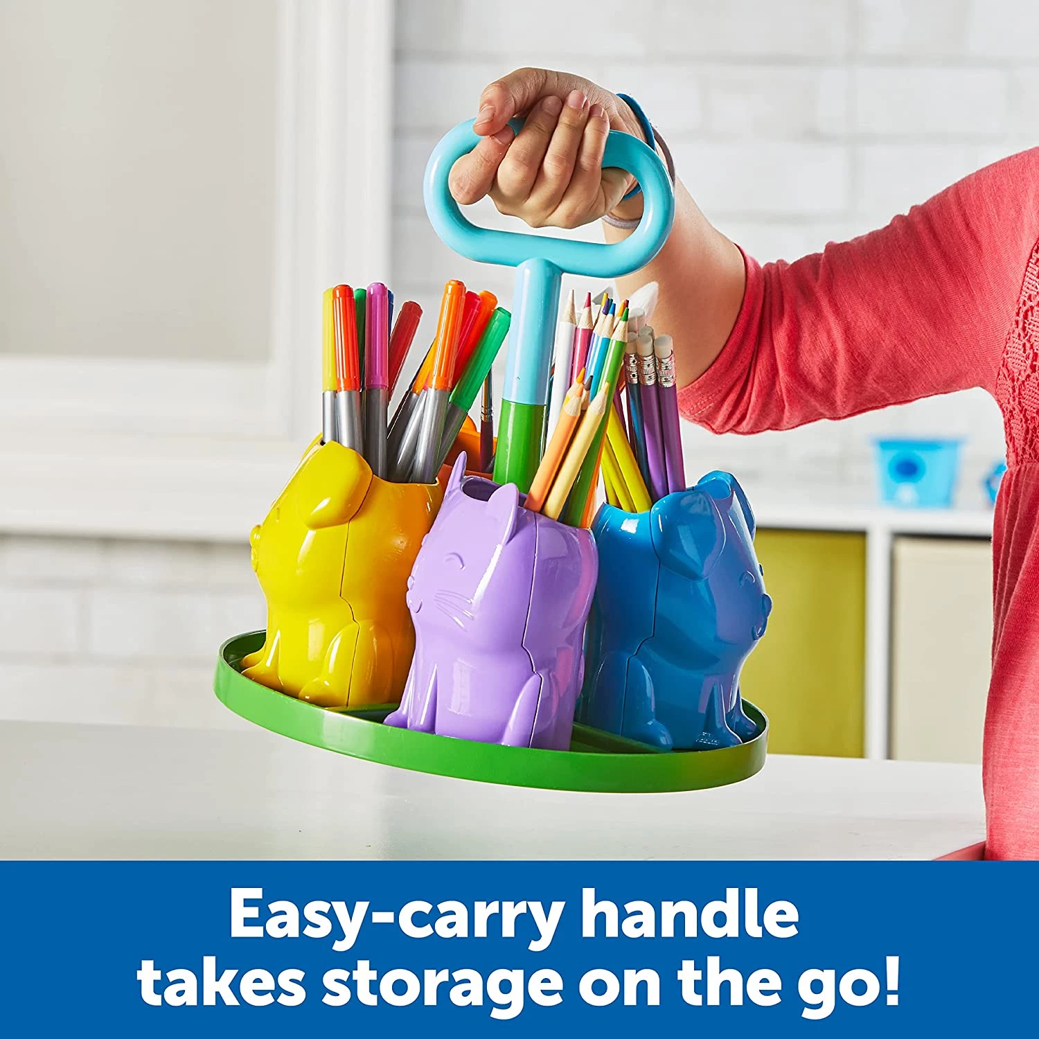 Каждый из 4-х съемных контейнеров из представленного набора предназначается для хранения всевозможных школьных принадлежностей — от ручек, карандашей и ножниц до клея и мелков. Органайзер от Learning Resources оснащен удобной ручкой, которая позволяет легко переносить его из комнаты в комнату.