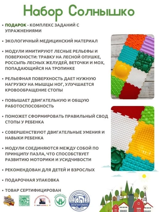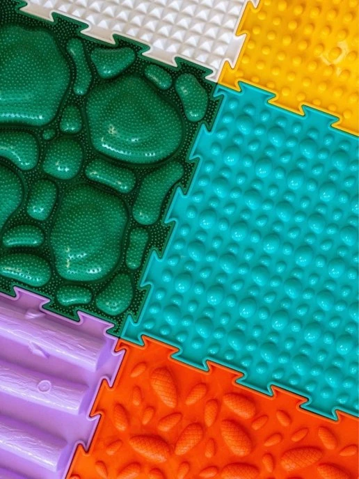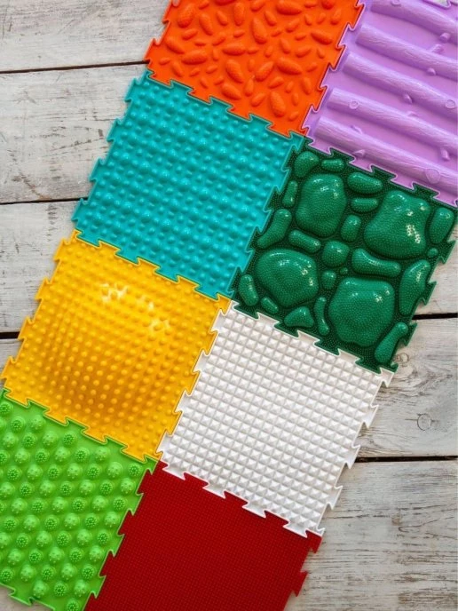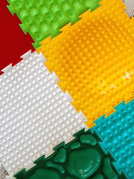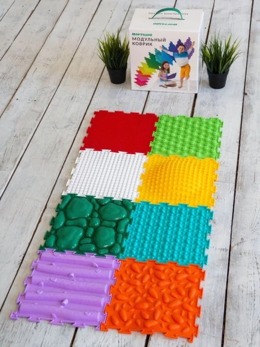 Ортопедический массажный коврик предназначен для использования дома, а также в лечебных центрах и детских комнатах. Благодаря различным рельефным поверхностям он отлично прорабатывает стопы, стимулирует кровообращение. Он состоит из восьми квадратов, легко и надежно соединяющихся между собой по принципу пазла. Каждый обладает различной степенью жесткости, что важно при решении и предупреждении многих проблем стопы. В разобранном виде его удобно хранить, а сборка не требует специальных знаний, ребенок сможет сделать это сам.