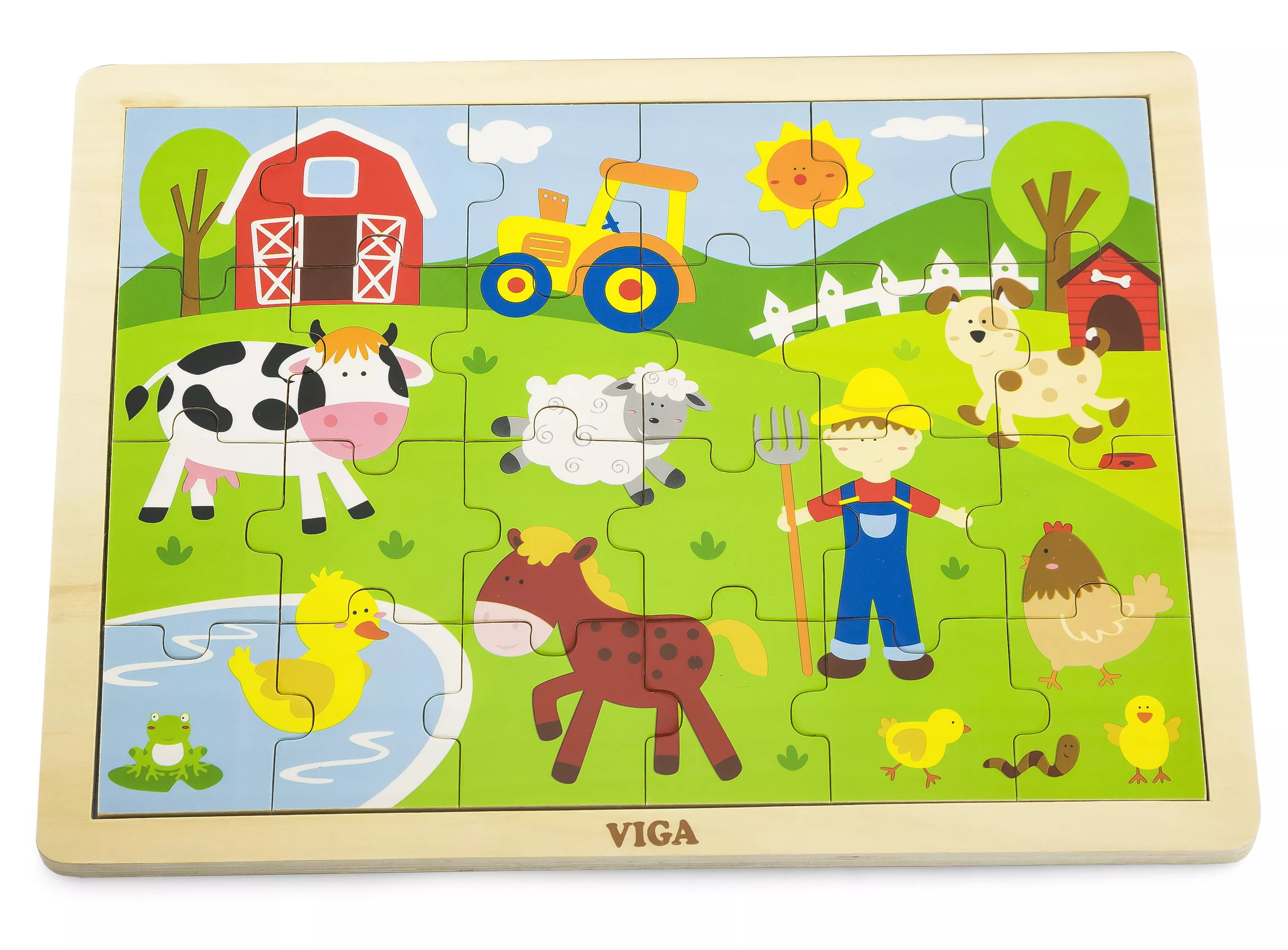 Малыш, а ну как посчитай и назови всех животных на этом пазле! Если не получается, родители тебе помогут. Классический пазл, в котором 24 деревянных элемента собираются в одну яркую картинку Ферма. Если ребенку сложно собрать пазл, он всегда может воспользоваться рисунком подсказкой на рамке. Все детали хорошо отшлифованы и раскрашены безопасными для детей красками.