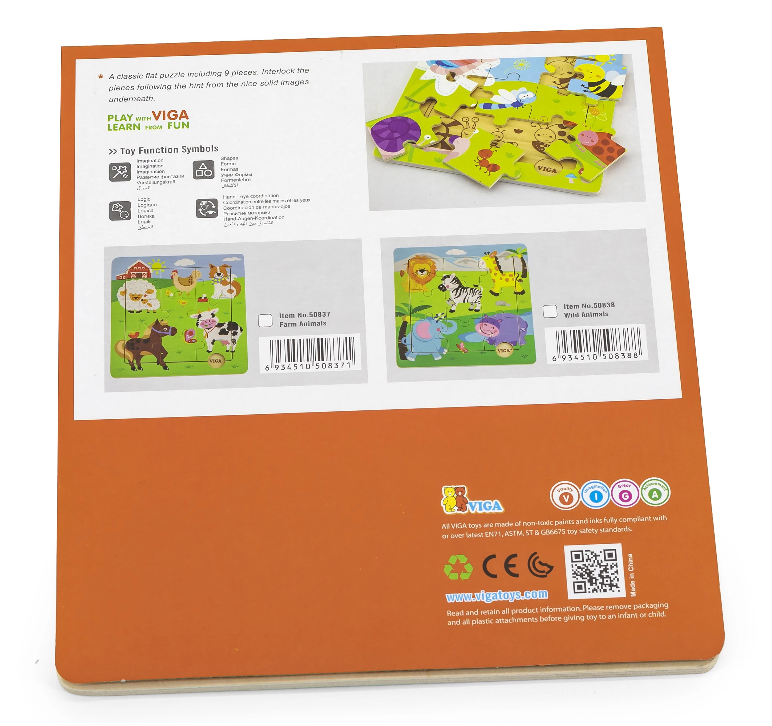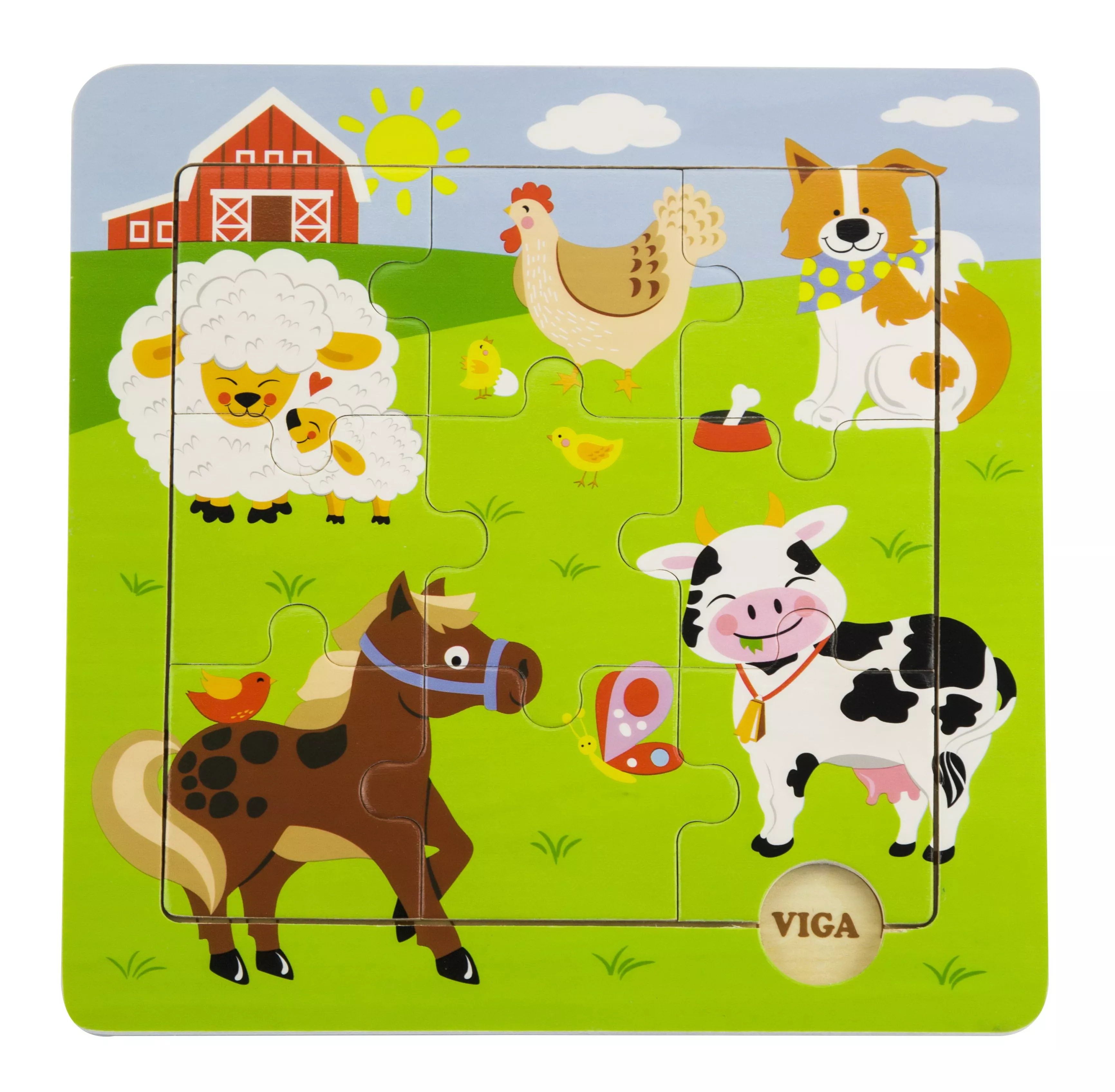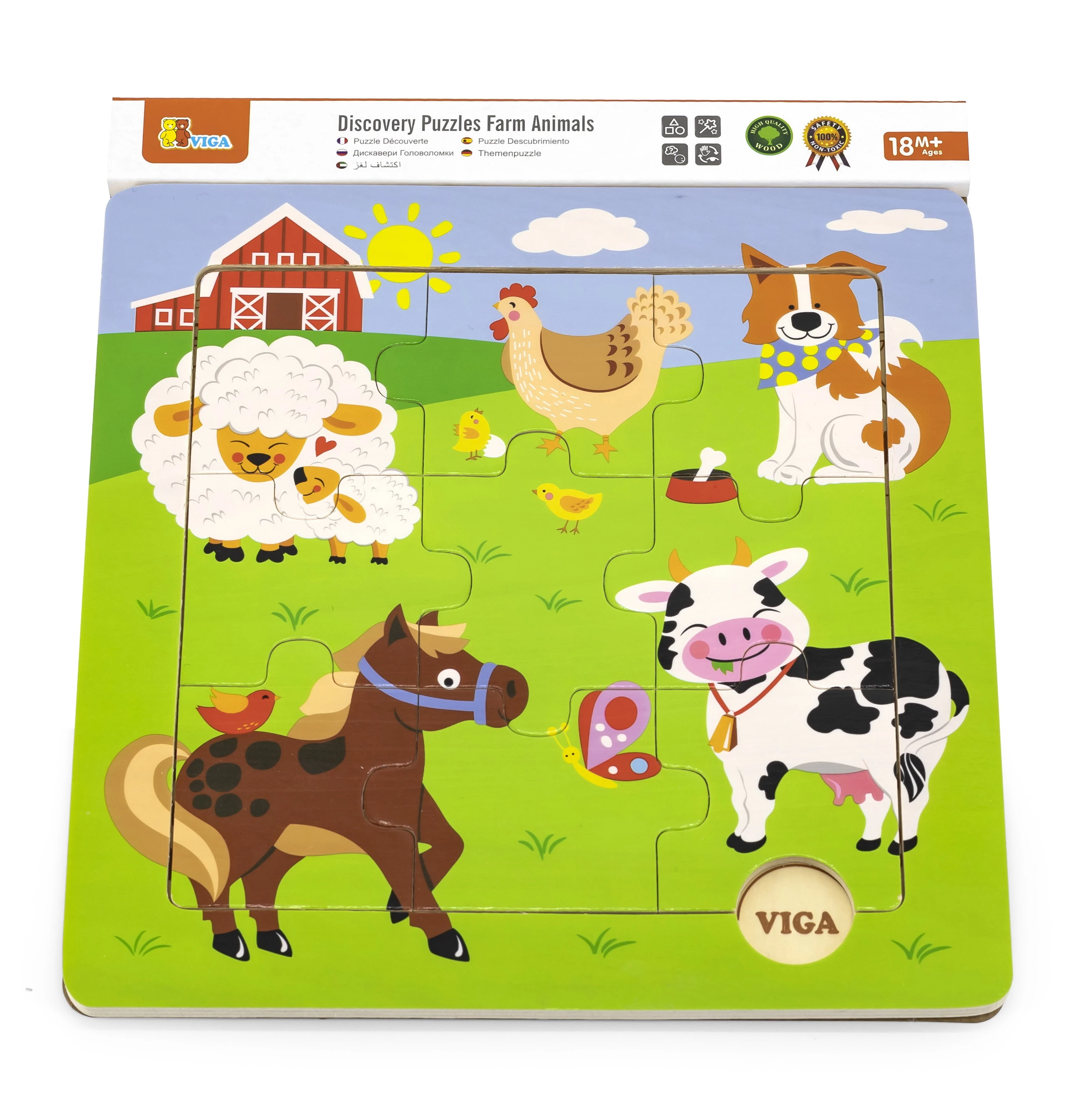 Красочный пазл с пятью домашними животными. Это средний пазл из серии пазлов Ферма. Ребенок, внимательно изучив картинку, пробует собрать ее правильно из 9 элементов. Ничего страшного, если не получится сразу. На деревянной рамке есть подсказка, по которой малыш может без труда собрать данный пазл.