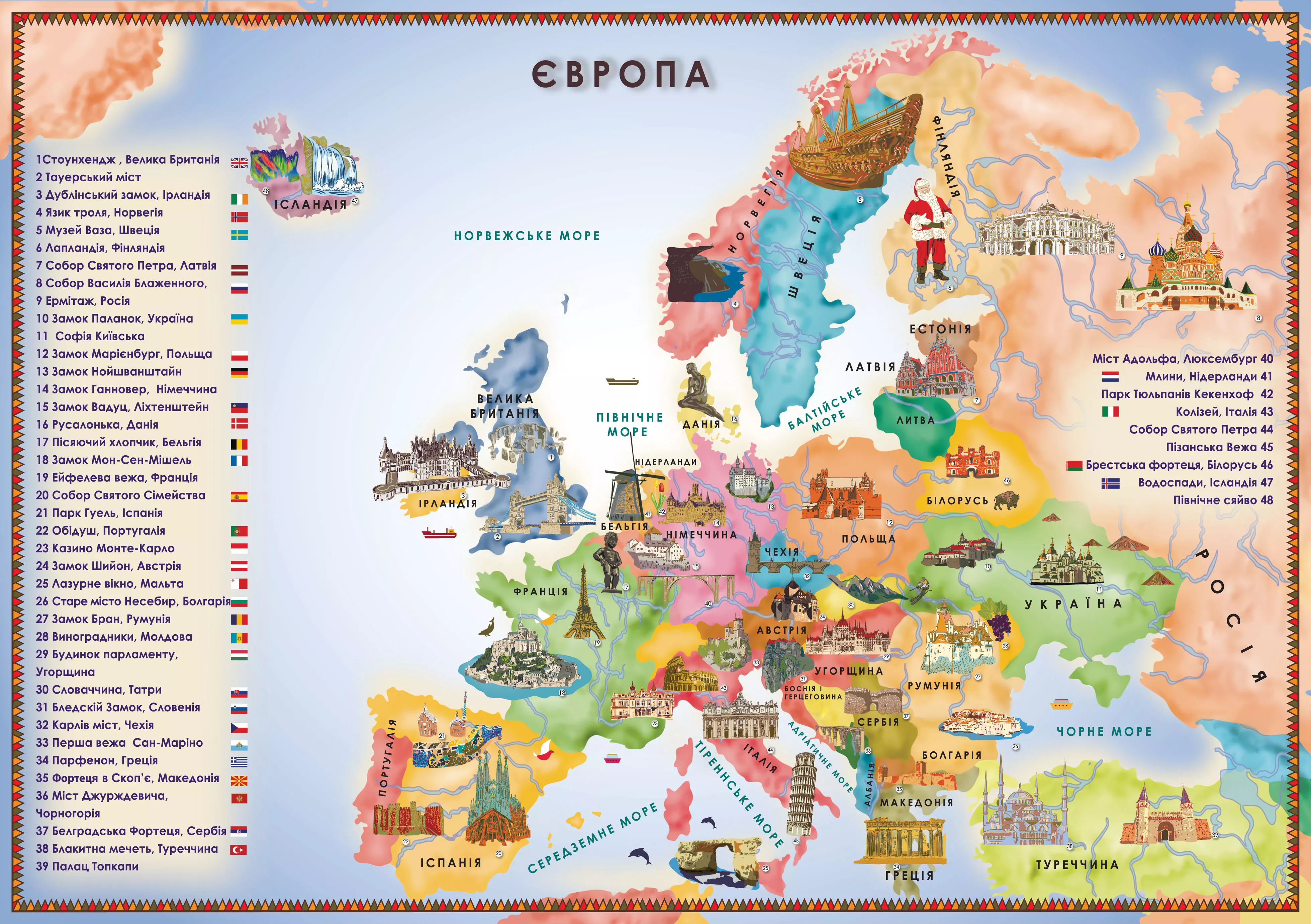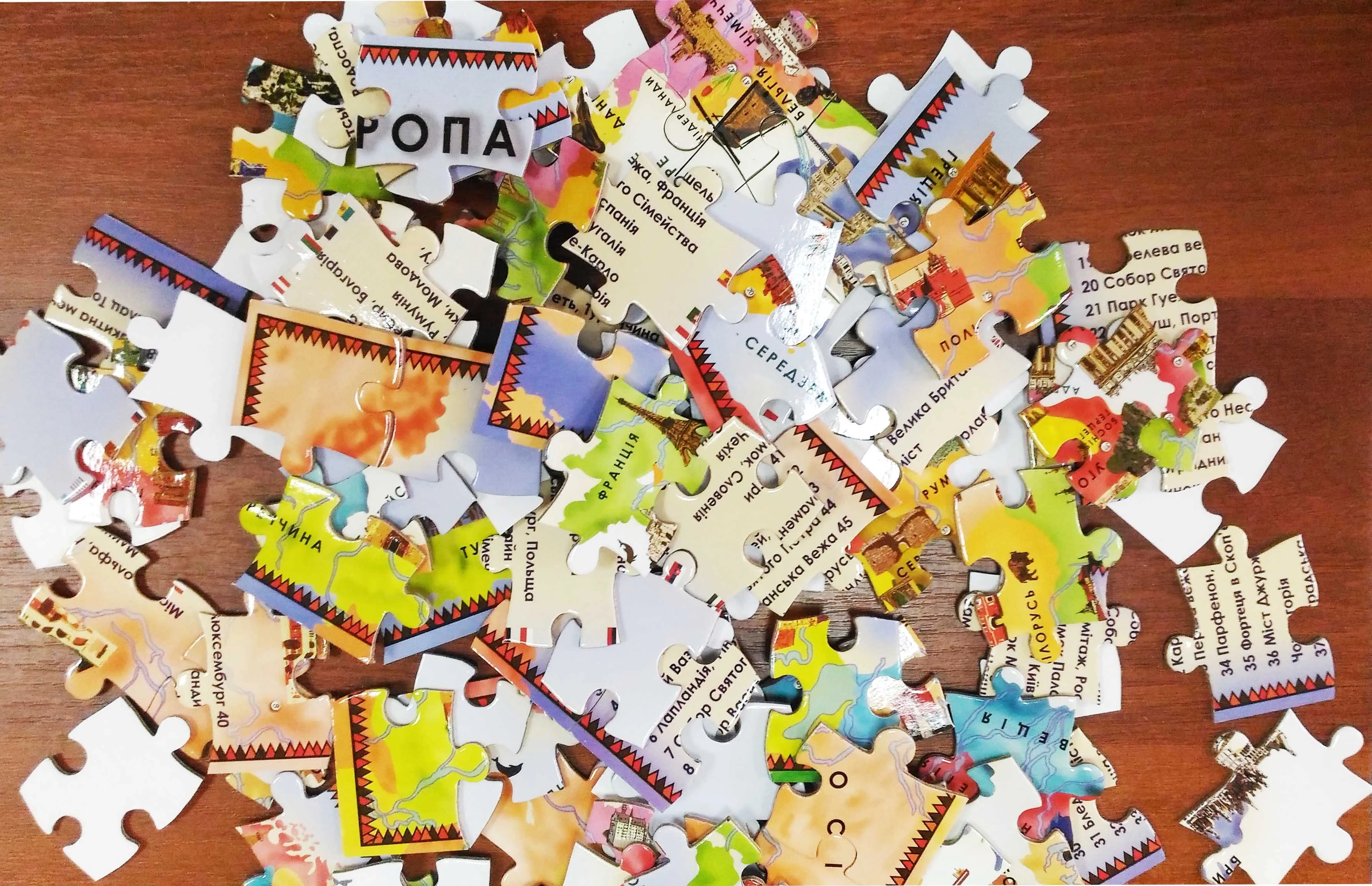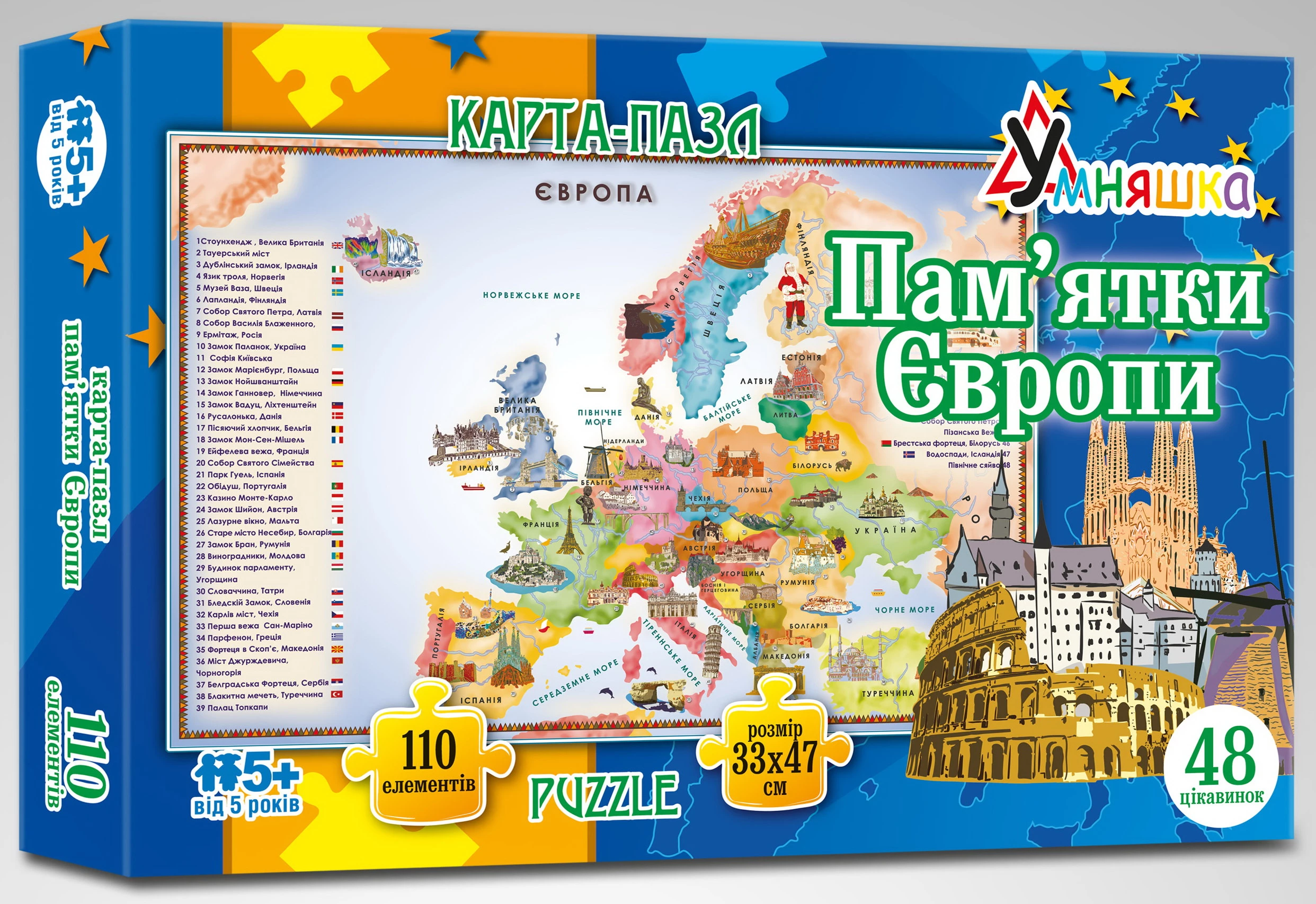 Очень интересная карта помогает запомнить 48 достопримечательностей Европы. Она выполнена в виде пазла, потому собирая ее, дети намного легче усваивают информацию. Помимо изображений имеется и названия того или иного объекта. Игра отлично развивает кругозор, внимательность, знакомит с географией и помогает стать более усидчивым. Подарить такой пазл можно ребенку на любой праздник и собирать его вместе с друзьями, родителями или самостоятельно.