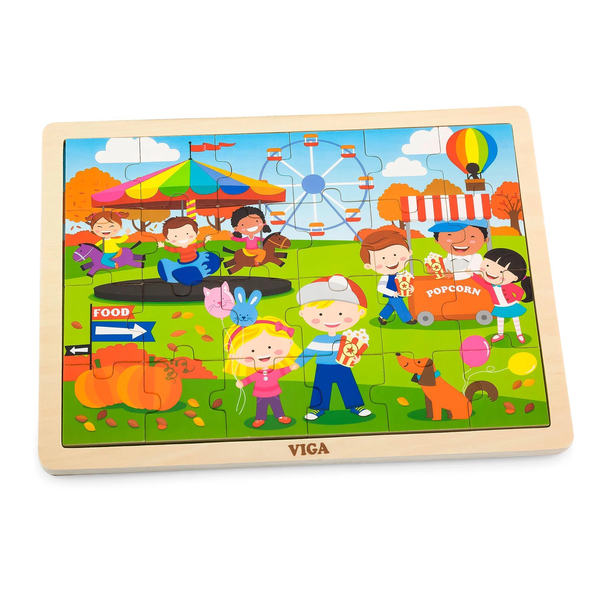 Яркий осенний парк с каруселями и сладкой ватой. Такая веселая осенняя картинка привлечет внимание ребенка и ему понравится собирать пазл. Детали пазла сделаны из дерева, края хорошо отшлифованы. Ребенок может использовать подложку как подсказку, кода собирает пазл.