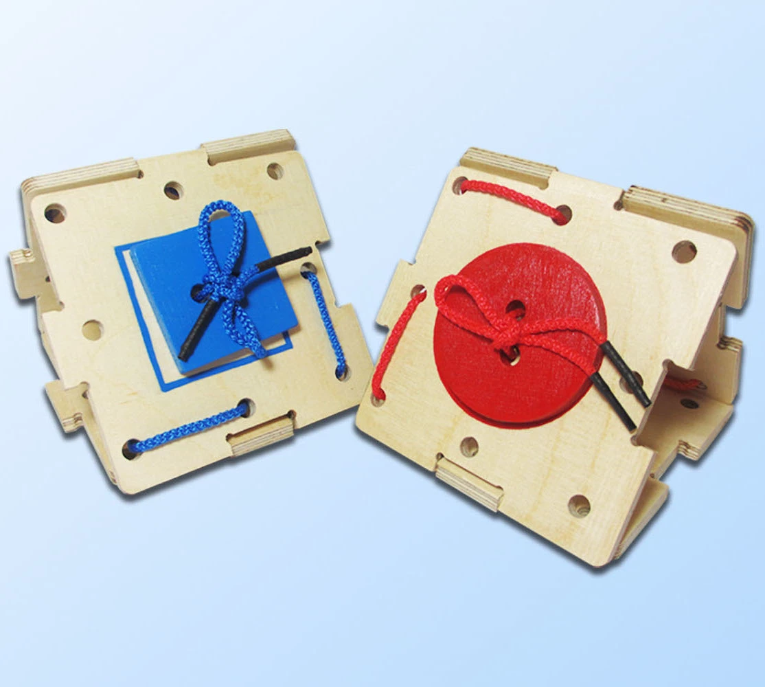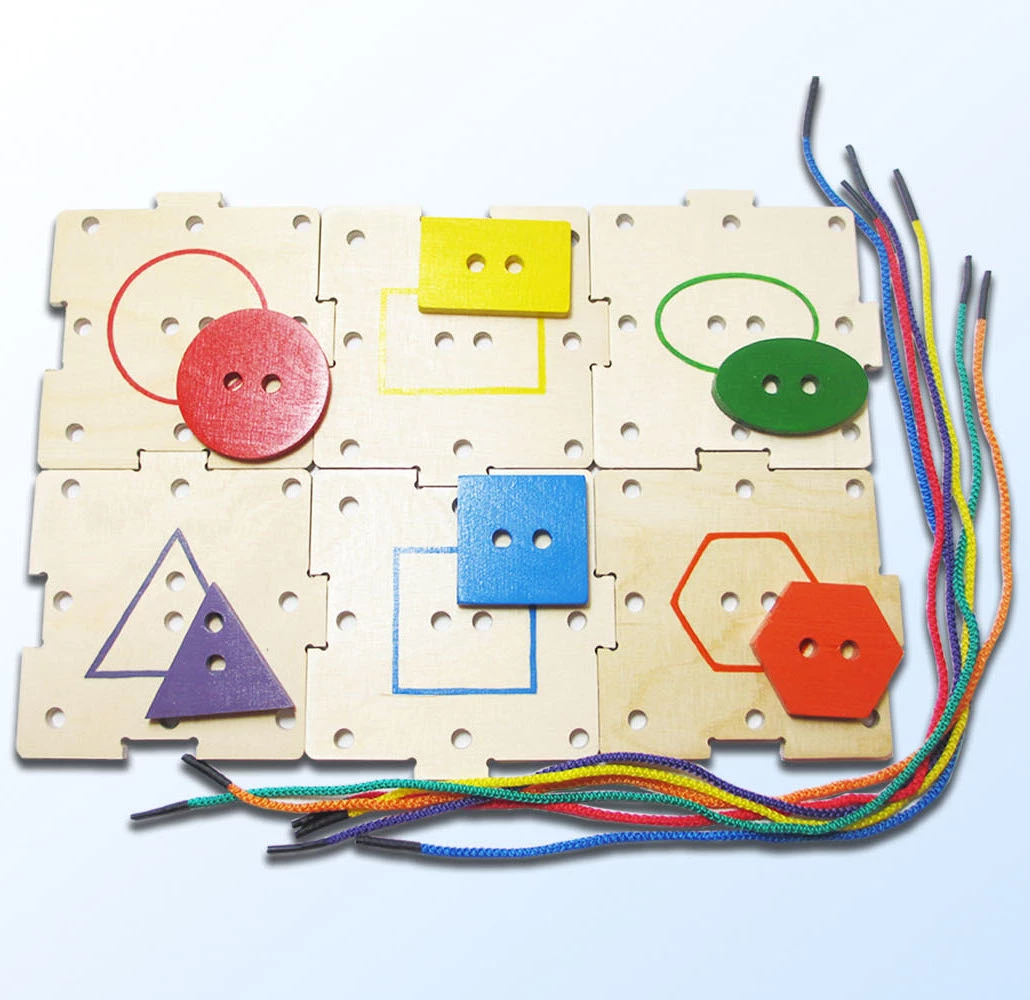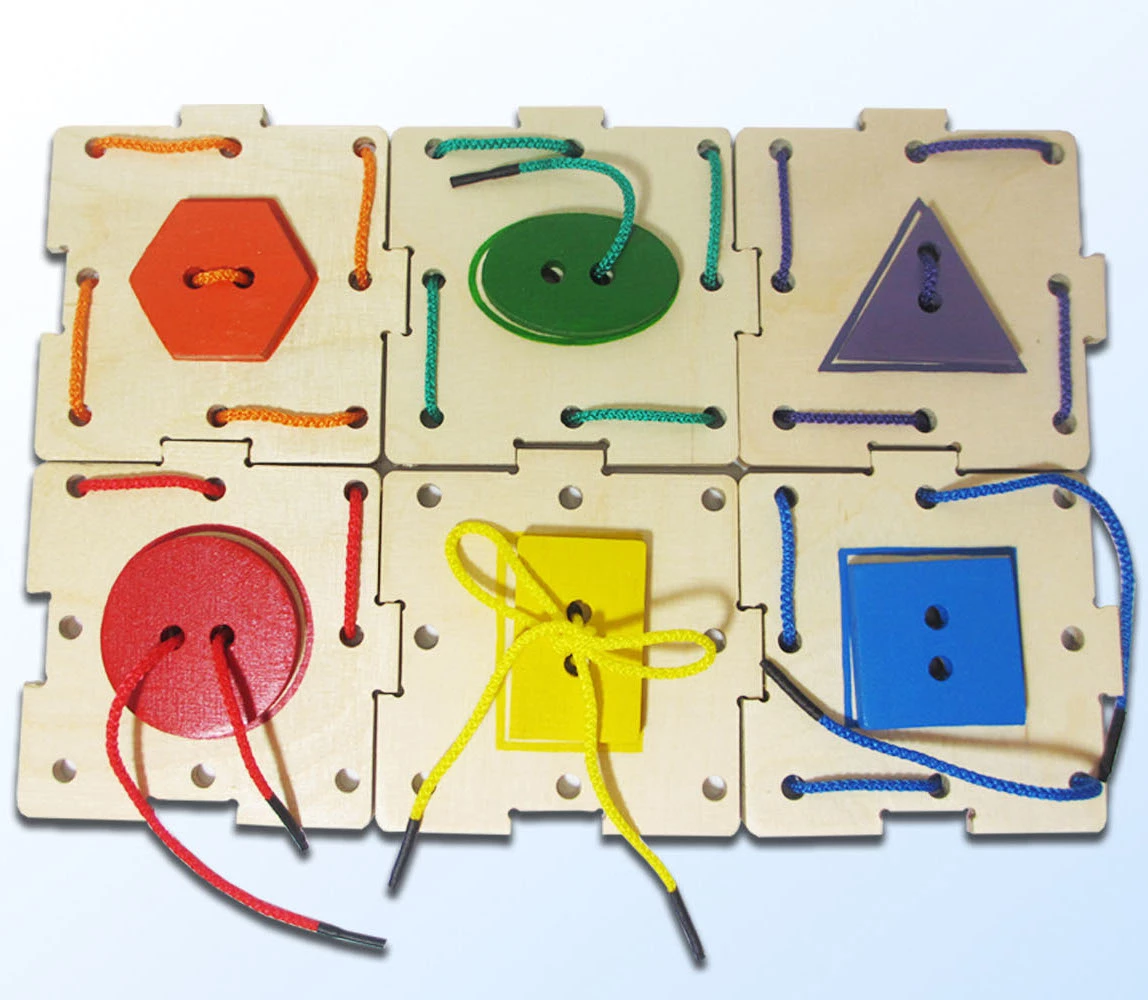 Эта развивающая игрушка, созданная талантливыми профессионалами украинской фирмы Hega, познакомит малышей в возрасте от трех лет с геометрическими формами, базовыми цветами, привьет навык завязывания шнурков и даже пришивания пуговиц. Игровой комплект включает в себя основу и шесть ярких геометрических фигур, окрашенных со всех сторон и соединенных с деревянным основанием посредством разноцветных шнурков.