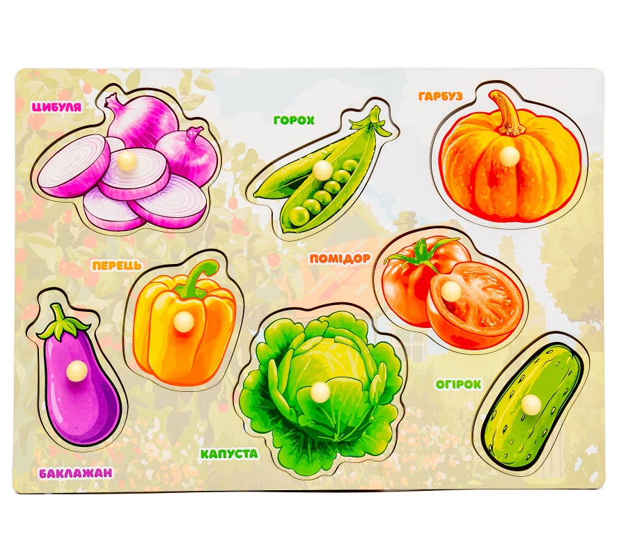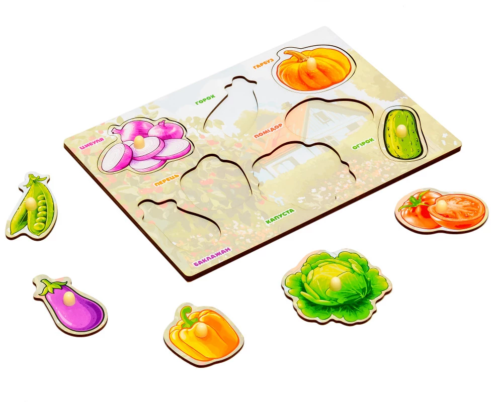 Этот красочный пазл-вкладыш создан для знакомства маленьких исследователей с миром садоводства. Набор включает в себя основу и 8 крупных фигурок вкладышей, каждая из которых изображает популярный овощ (огурец, помидор, капусту и другие). Фигурки легко извлекаются и вставляются в углубления благодаря удобным ручкам и крупному размеру.