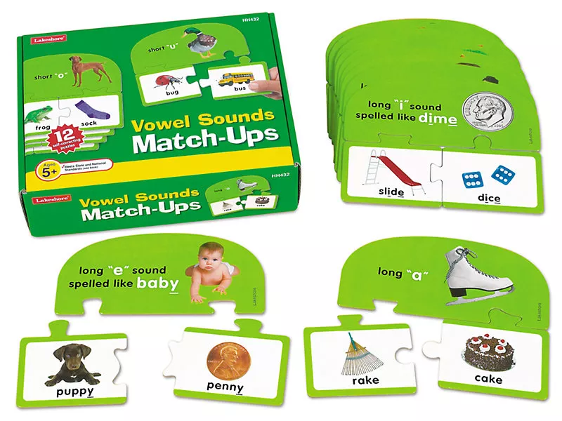 Этот набор из пазлов предназначен для изучения гласных звуков, в форме игры дети быстрее запоминают. Языковые навыки развиваются вследствие складывания пазлов. К картинке с заданием крепятся два соответствующих пазла, задача игрока правильно соединить рисунок с надписями. Необходимо озвучивать написанное, чтобы лучше запомнить особенности гласных. Дети учатся выделять длинные гласные звуки в словах. Всего в наборе 12 головоломок с фото, можно играть со взрослыми или под их контролем.