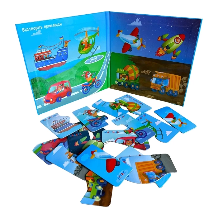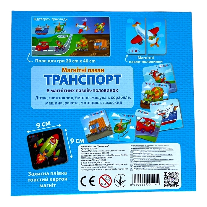 Набор включает в себя 8 магнитных пазлов-половинок с изображениями различных транспортных средств, 16 магнитов, размер пазлов 9 x 9 см.