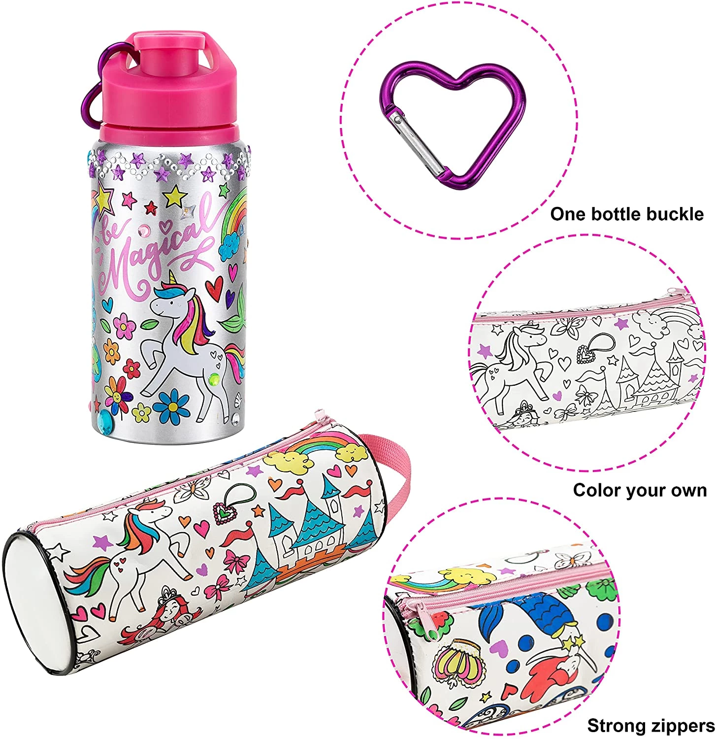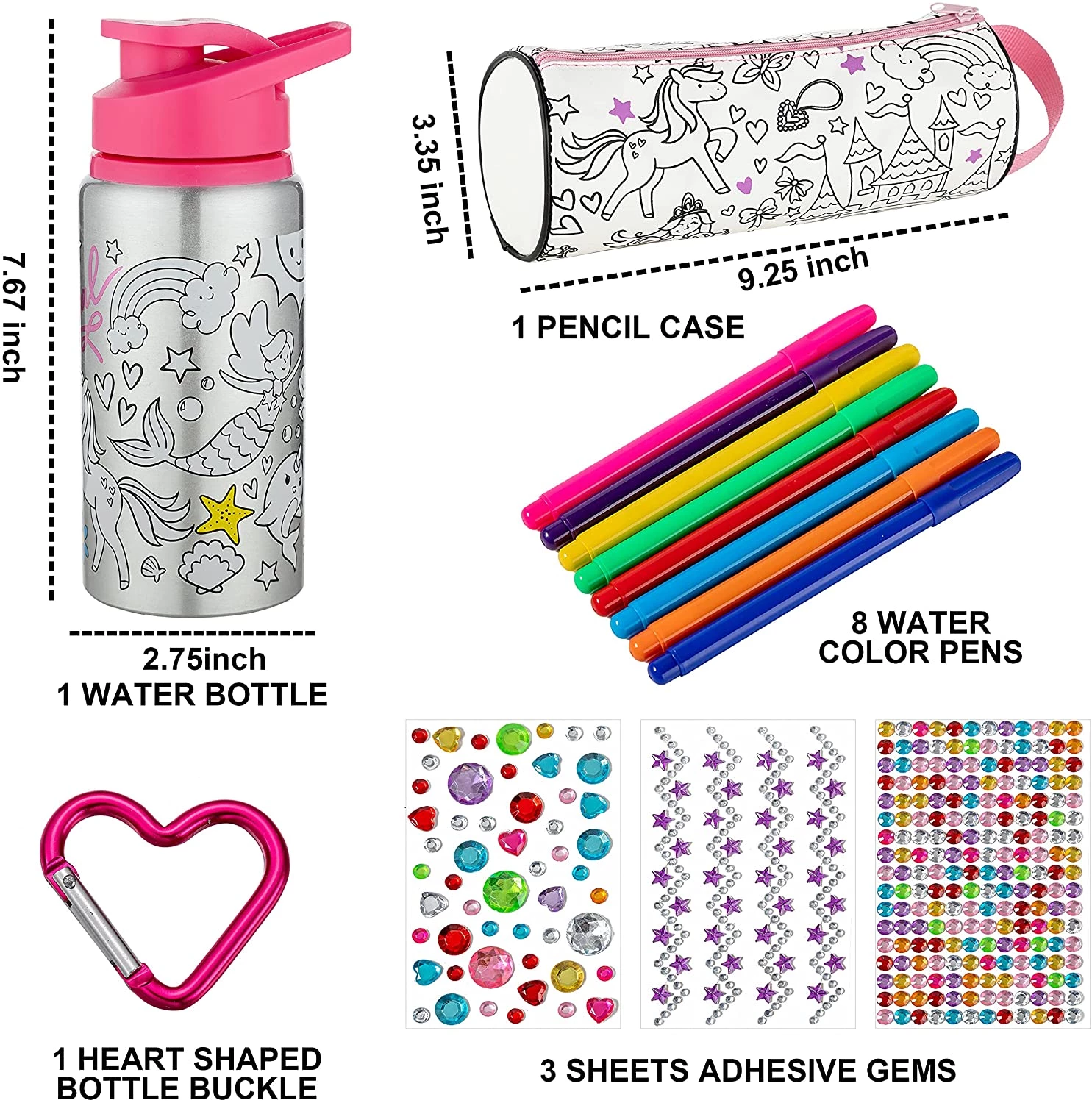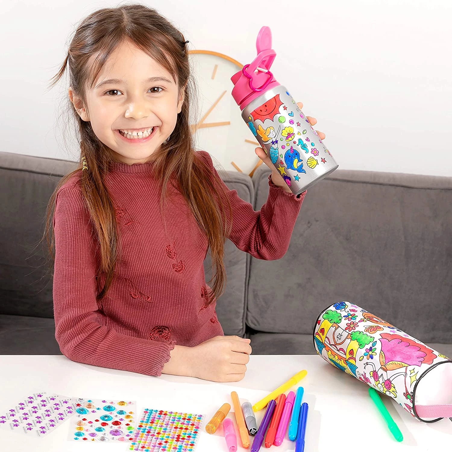 Замечательный творческий набор для юной модницы, она сможет раскрасить его по своему усмотрению и создать неповторимый авторский дизайн. В комплекте прилагается 8 разноцветных акварельных ручек и несколько видов стразов, которыми можно украсить пенал и алюминиевую бутылочку для воды. Такой набор может стать отличным подарком на любой праздник, ведь он развивает мелкую моторику, воображение и чувство стиля. С помощью специально пряжки в форме сердечка, пенал можно будет куда-то прикрепить. Дайте волю своему воображению и создайте уникальный шедевр!