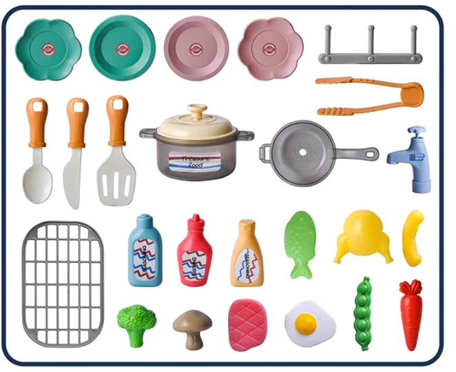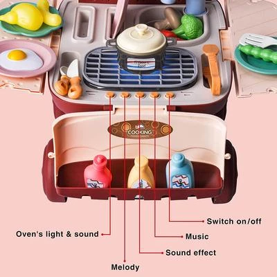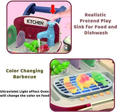 Это уникальный и очень интересный набор прекрасно развивает мелкую моторику, воображение и навыки приготовления пищи. Тут есть множество очень занимательных функций, таких как звуковые и световые эффекты. Например, плита светится голубым при “нагревании”, а продукты на барбекюшнице меняют цвет при “запекании”. Кран с подачей воды, и дети могут помыть посуду и продукты в мойке.