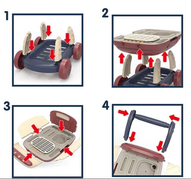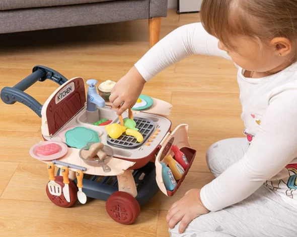 Ребенок может воображать себя покупателем магазина или настоящим шеф-поваром. Мобильная кухня выполнена в виде тележки супермаркета и может перемещаться на колесиках.