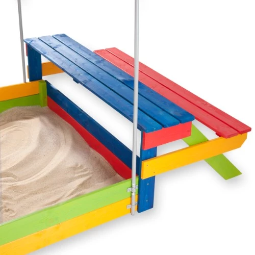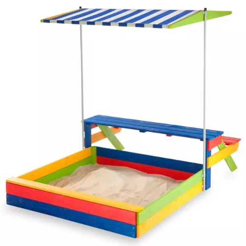 Детская песочница - это одно из самых любимых мест для отдыха у детей. В комплекте можно найти саму песочницу, с обратной стороны песочницы находится деревянный разноцветный столик и лавочку, а также крышу, которая сможет защитить от непогоды. Известно, что с помощью песочниц, дети могут развивать мелкую моторику рук и пальцев, координацию движений, а также при создании фигур из песка малыш может вырабатывать свои творческие способности. Таким образом, ребенок сможет не только весело и интересно проводить время на свежем воздухе, а также саморазвиваться.