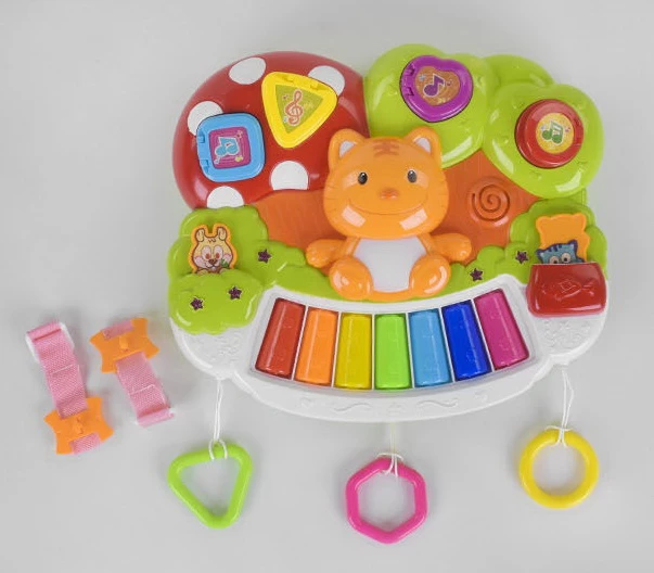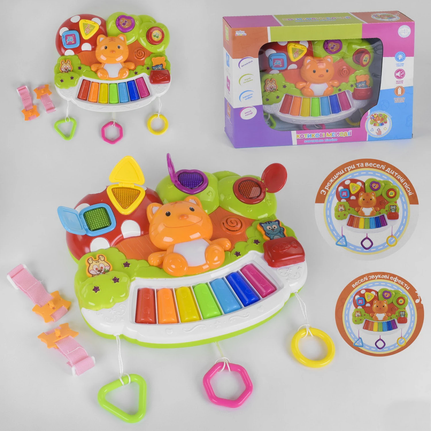 Очень яркая и интересная интерактивная игрушка, с украинской озвучкой, идеально подойдёт для любознательного малыша. Пианино имеет три звуковых режима: мелодии, цифры от 1 до 7, семь нот. Переключать их необходимо с помощью рыжего кота, расположенного по центру конструкции. Пианино оснащено креплениями для кроватки, стульчика или коляски. Озвучка игрушки выполнена на украинском языке, малышу будет очень интересно играть с ней. Имеются небольшие подвески, которые можно рассматривать и крутить в руках.