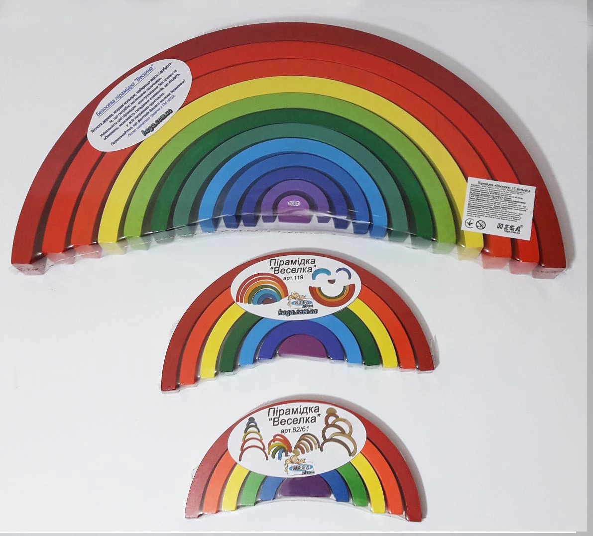 Пирамидка «Радуга» от украинской фирмы Hega порадует вашего малыша своими игровыми возможностями. С ее помощью кроха сможет выучить цвета и их названия, а, как известно, для деток младше трех лет это довольно сложно. Также игрушечная пирамидка познакомит ребенка с понятием размера (больше и меньше).