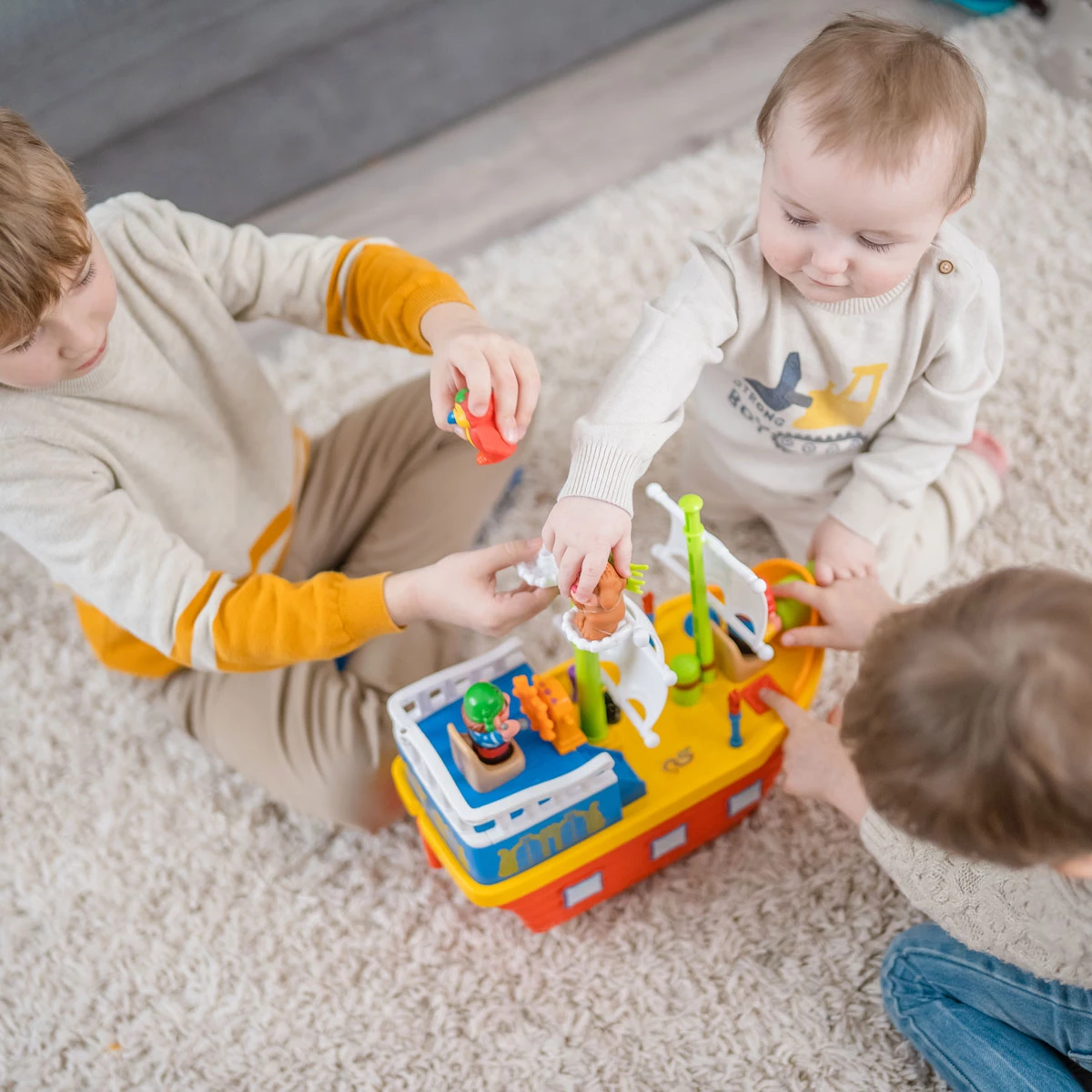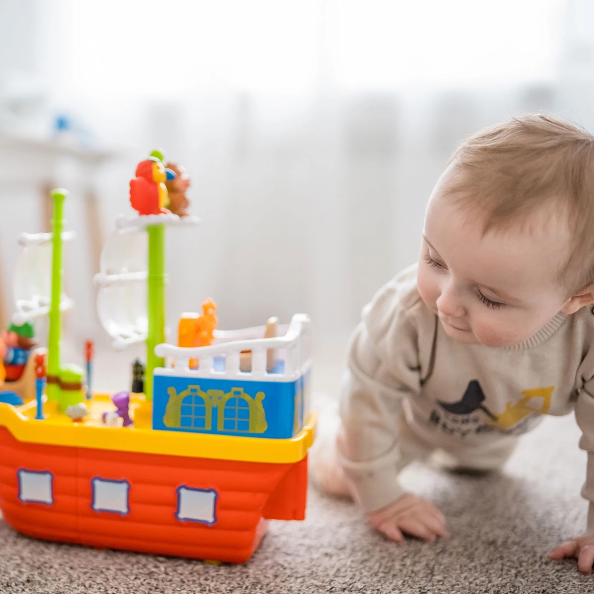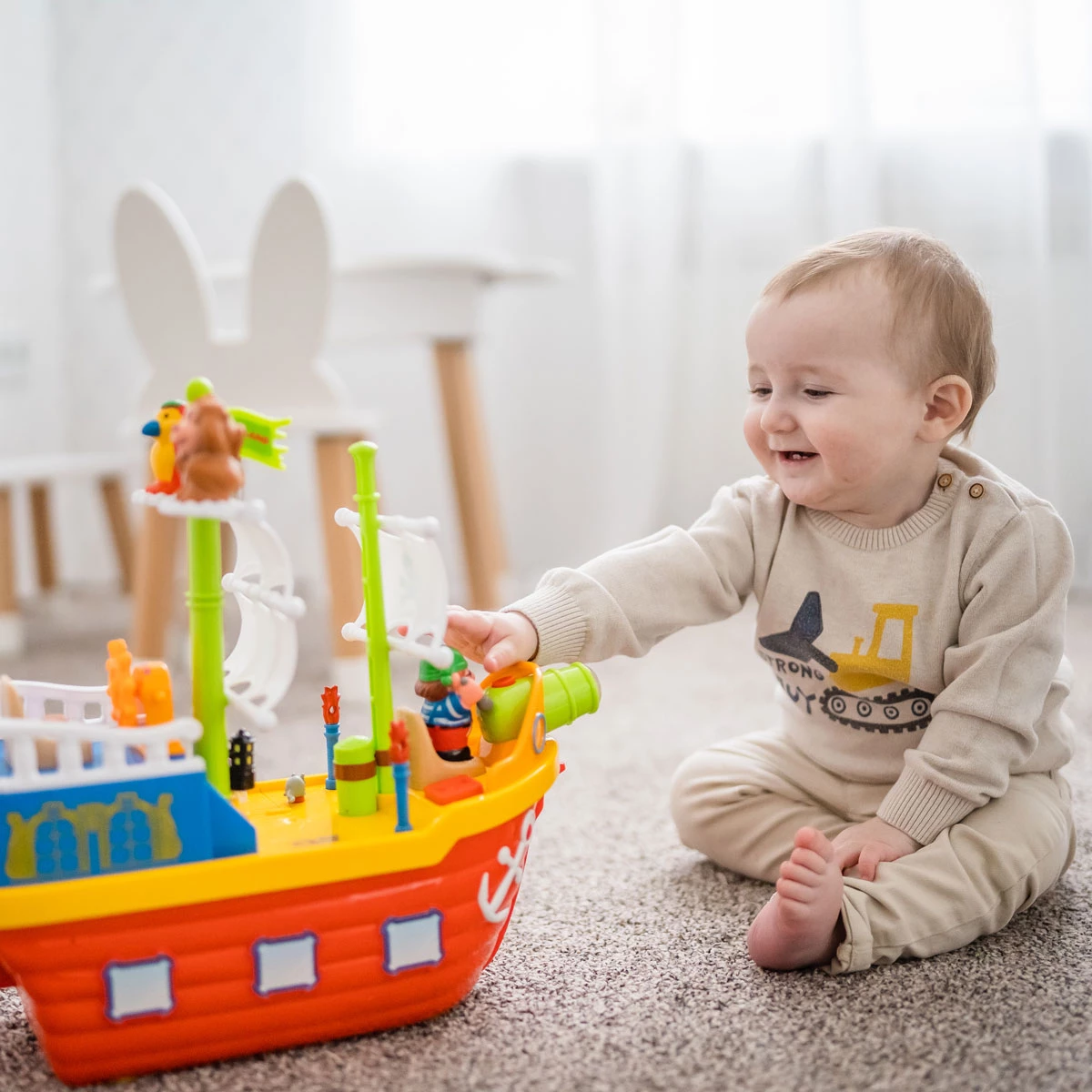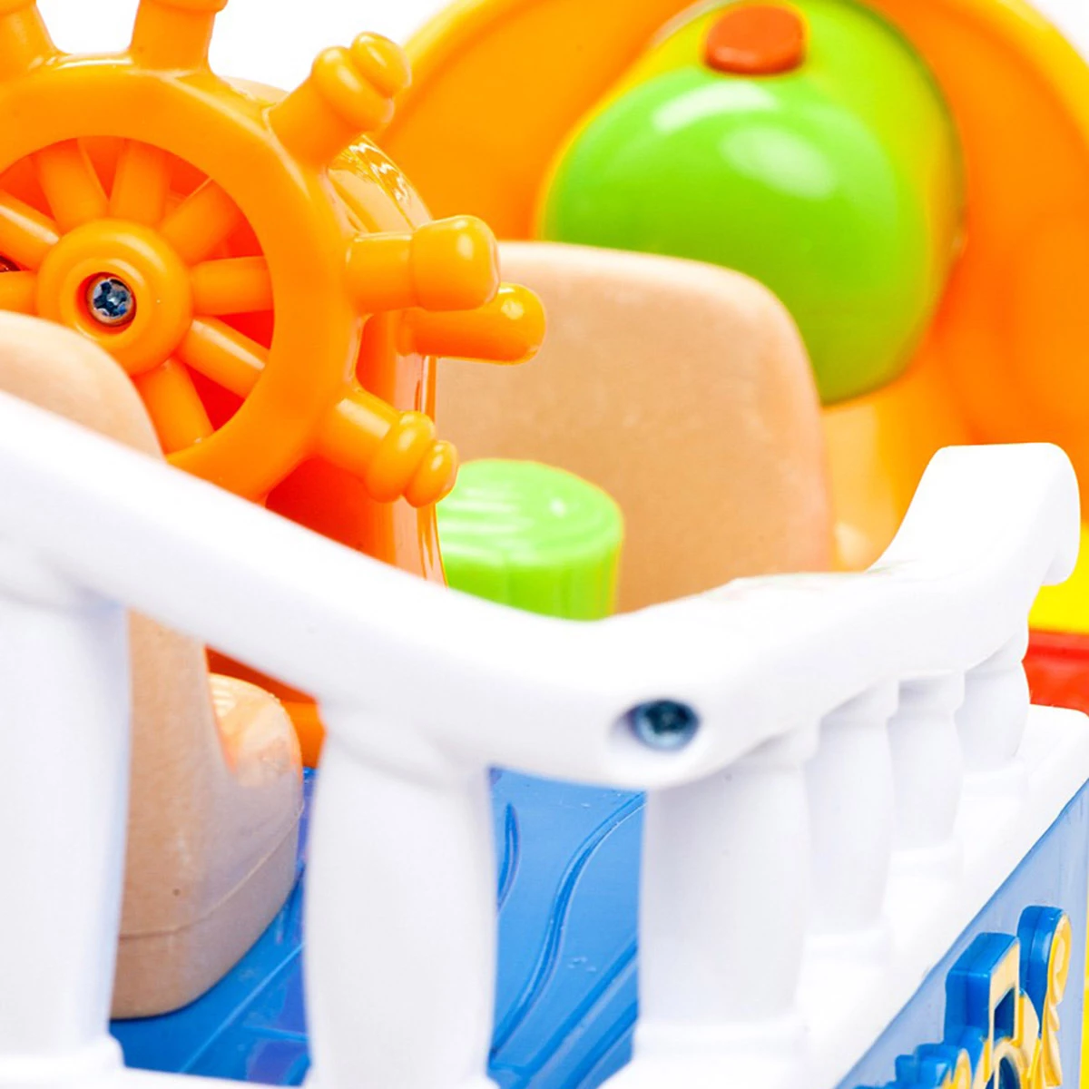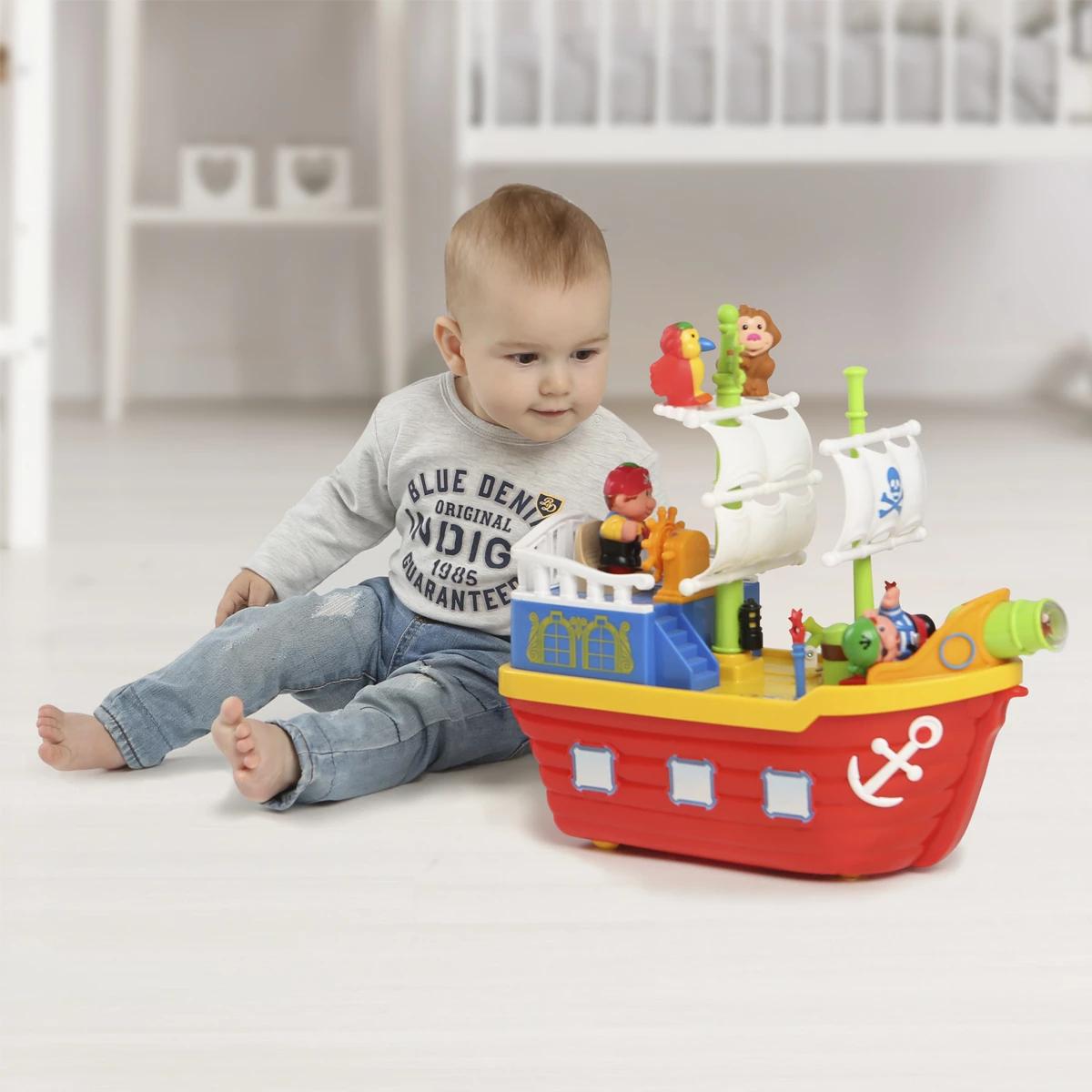Корабль оснащен колесами, позволяющими ребенку катать его в любом направлении.
