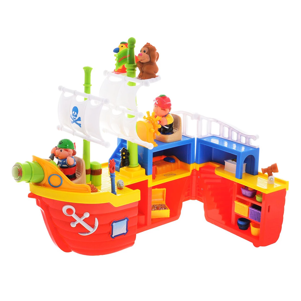 Подарите ребенку множество позитивных эмоций! С игровым набором «Пиратский корабль» маленьким непоседам гарантирована увлекательная игра и хорошее настроение. Модель настоящего парусного корабля выполнена из качественного и прочного пластика. На палубе расположены 2 мачты, мостик капитана со штурвалом, а также пушка. При повороте штурвала можно услышать корабельный звон и реалистичный шум волн. Внутри пушки зажигается лампочка и звучит звук пушечного выстрела.