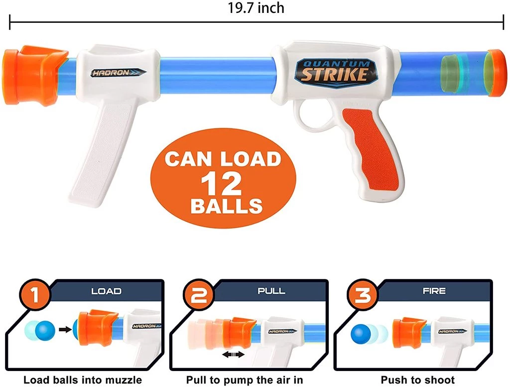 Увлекательный набор для физического развития ребенка и увлекательной игры. В наборе 2 воздушных пистолета с шариками. Можно устроить веселое соревнование кто больше попадет в мишени. Каждый воздушный поппер бластер длиной 51 см и в него можно загрузить 12 шаров одновременно.