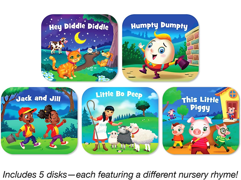 Дети выучат на память веселые детские стишки, переходя от одной очаровательной иллюстрации к другой! Достаточно просто вставить диск в специальное устройство для просмотра и потянуть за рычаг, чтобы пройти через 7 сцен, развивая устную речь и навыки памяти в процессе увлекательной игры.