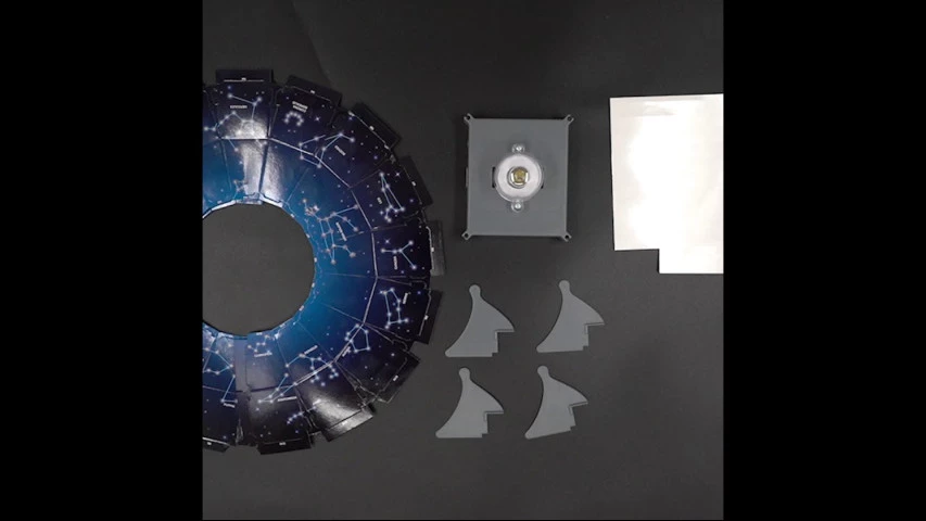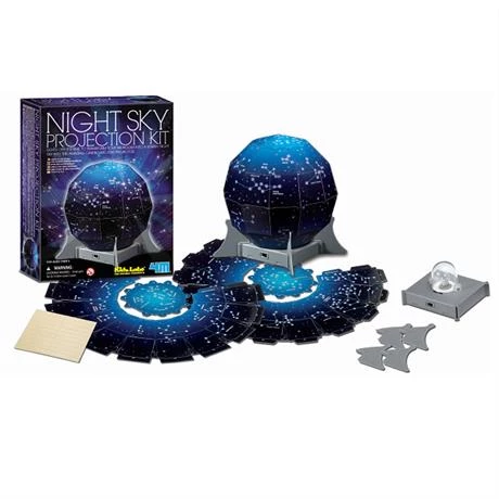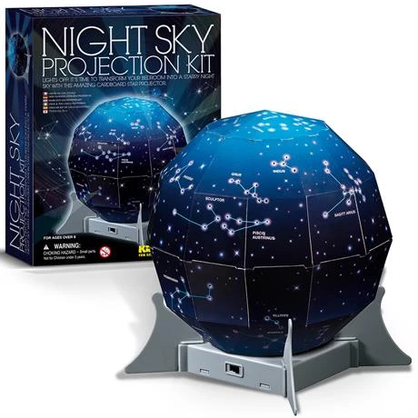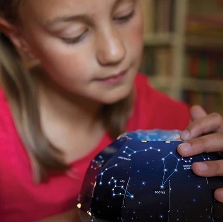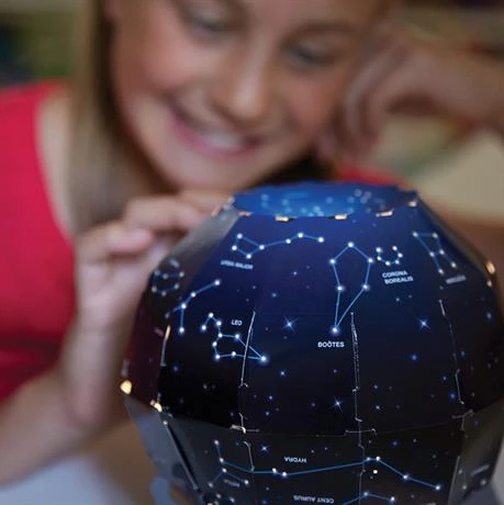 Этот замечательный набор точно понравится ребенку! Настоящая модель ночного неба с полной картой созвездий собирается с помощью прилагаемой инструкции. Нужно выбрать схему расположения звезд: южное или северное полушарие. Получившийся купол вставить в подставку, включить проектор и поставить в центр комнаты. Чтобы погрузиться в астрономические приключения нужно просто выключить свет в помещении. На потолке и стенах появятся настоящие звезды, их можно рассматривать и изучать.