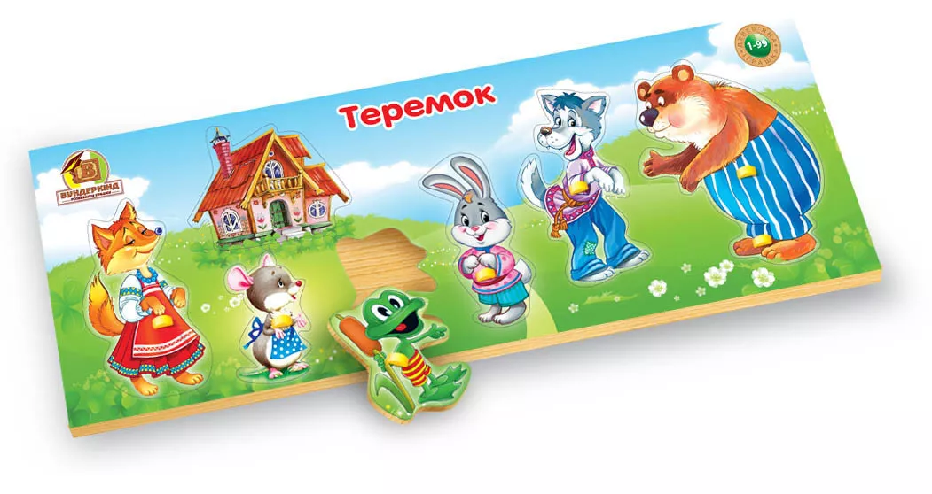 Рамка-вкладыш с любимой сказкой Теремок про зверей которые живут в Теремке - отличный методический материал для занятий дома или в садах Монтессори. На рамке есть 7 фигур - 6 зверей и 1 домик.