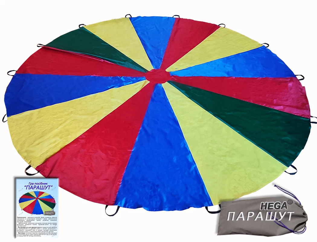Перед вами яркий тканевый парашют круглой формы, разделенный на несколько цветных секторов, в которых по кругу расположены ручки. Основное предназначение данного изделия — коллективная игра. Изделие диаметром 3 метра предназначается для игр в спортзале, в большом помещении или на лоне природы. В процессе игры дети обучаются командной работе, умению ощущать движения остальных участников игры.