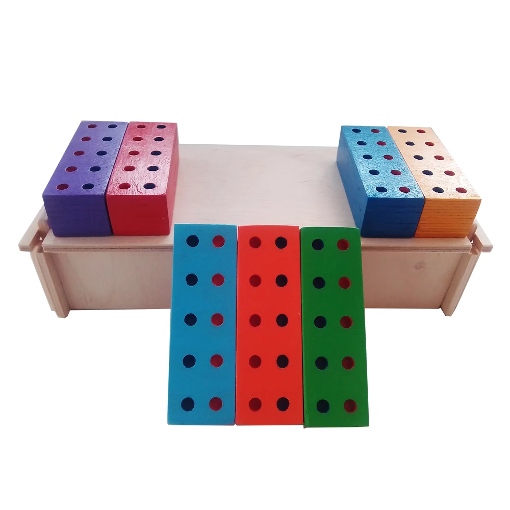 При помощи представленной игры можно изучать состав числа 10 (на каждом кирпичике имеется по 10 кружочков). Также набор позволяет проводить звуковой анализ (точки на кирпичике окрашены в красный и синий цвета). Деревянные брусочки могут использоваться для проведения различных упражнений на физкульт минутках: бруски можно передавать по кругу в паре и так далее.