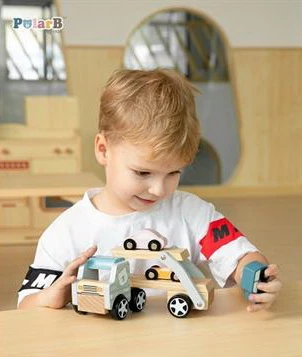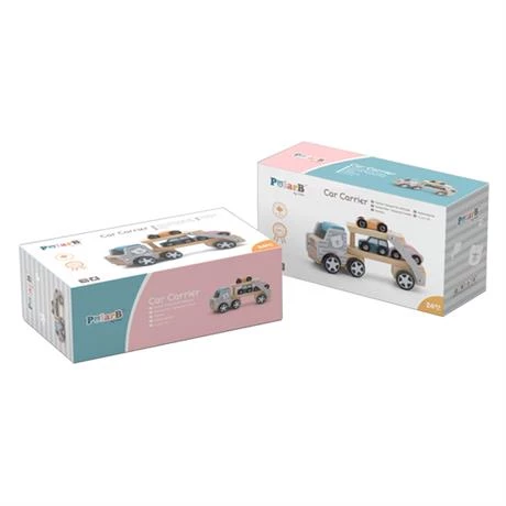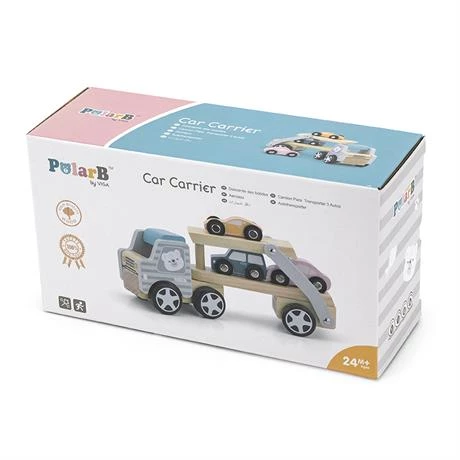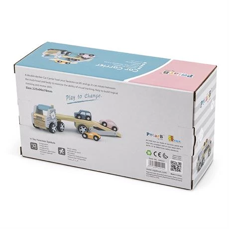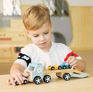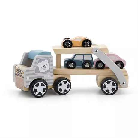 Деревянный автомобилевоз состоит из тягача и платформы для перевозки 3-х легковых авто. Верхний уровень платформы можно опустить для загрузки и выгрузки машинок. Машинки сделаны из дерева, окрашены в пастельные цвета с красивым рисунком. Все края и детали отшлифованы.