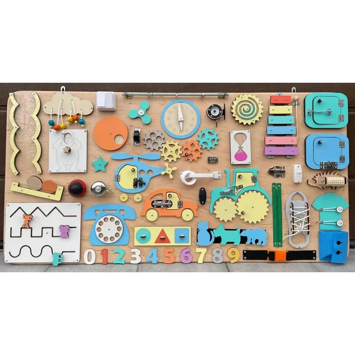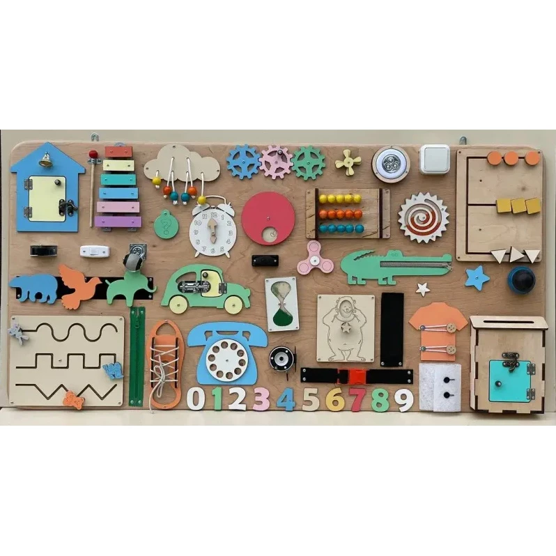 Развивающий бизиборд для детей, на основе методики «Монтессори». Бизиборд идеально подходит для развития мелкой моторики и других навыков малыша. Ребенок освоит умение открывания и закрывания, логические навыки. Кроме того, бизиборд поможет защитить ребенка от травм, так как малыш будет играть не из реальными бытовыми предметами.