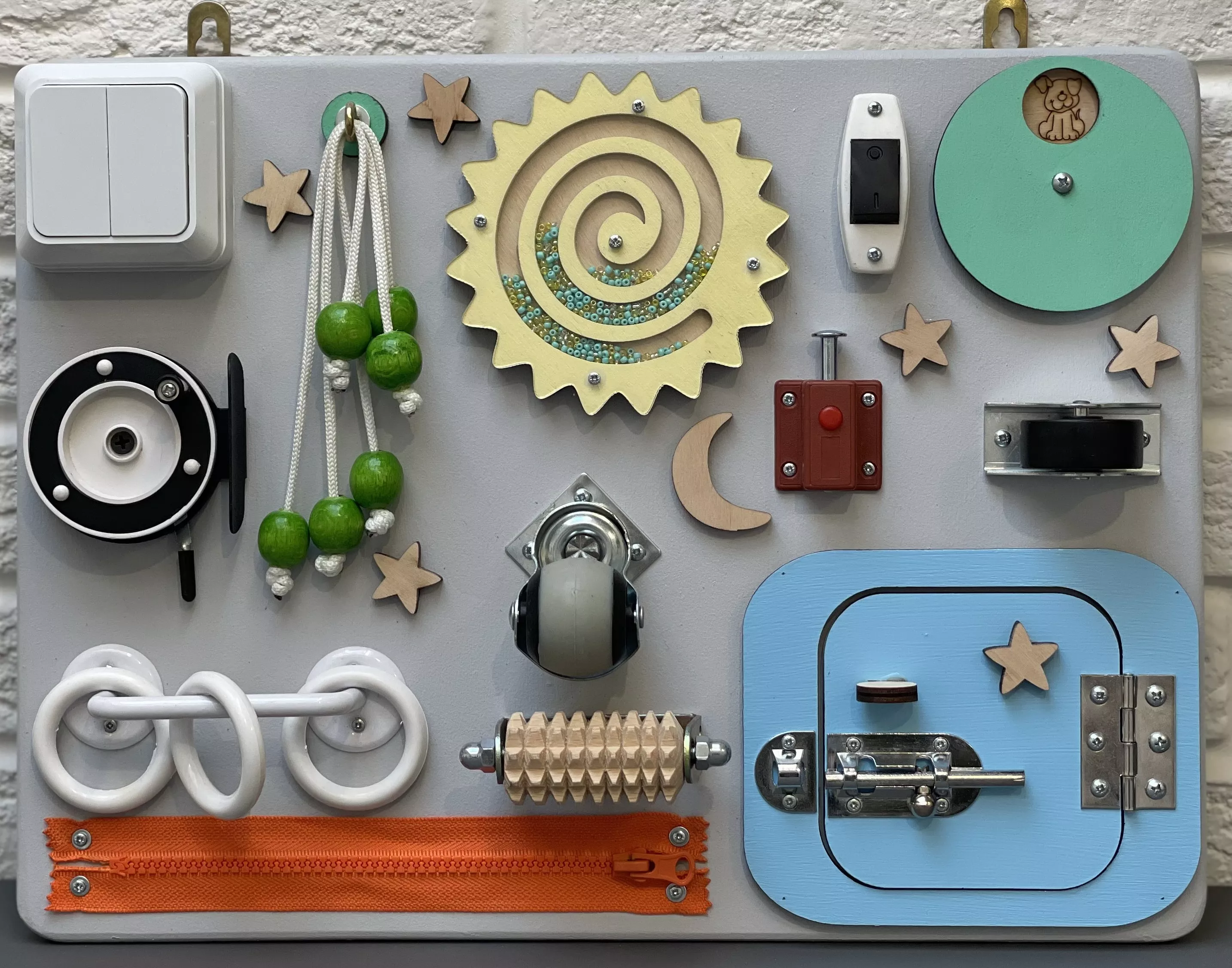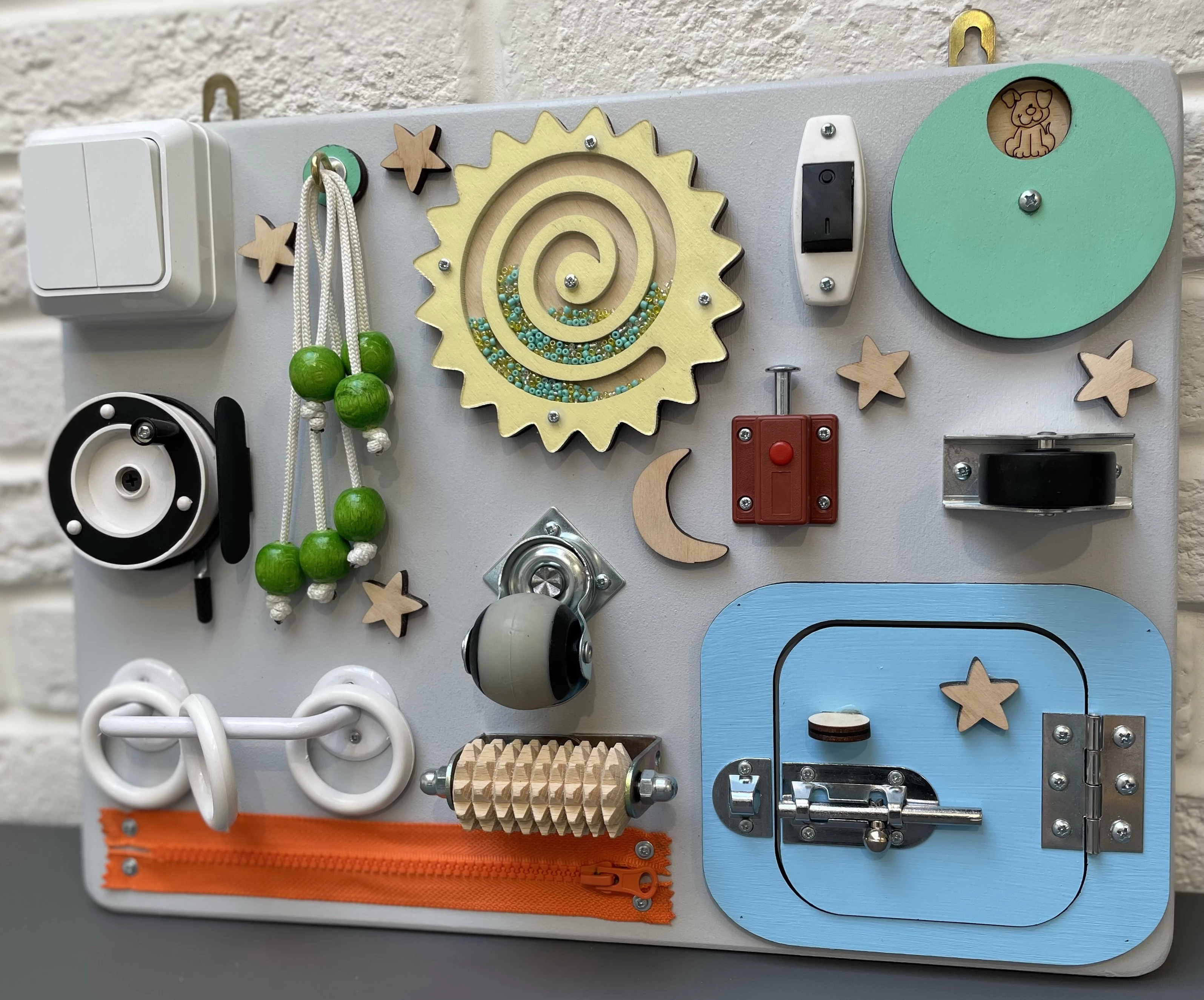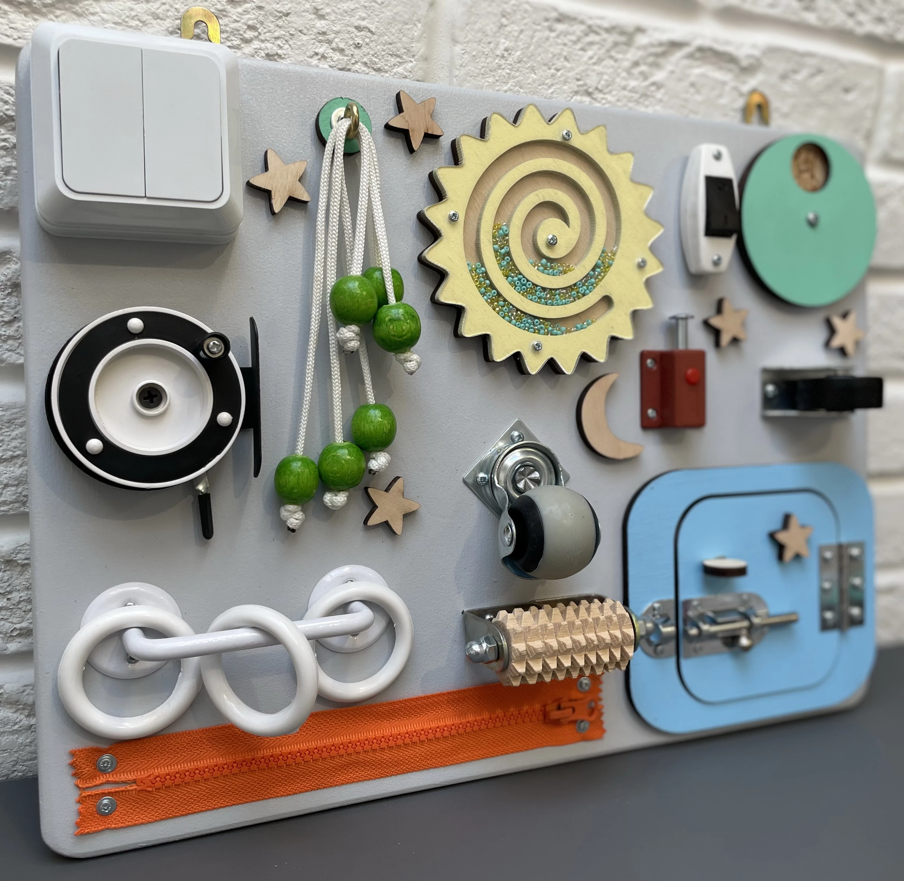 Бизиборд предназначен для развития мелкой моторики, логического мышления и памяти. При взаимодействии с различными функциональными элементами, ребенок осваивает новые навыки и хорошо тренирует свой мозг. На данном изделие присутствуют всевозможные выключатели, замок-щеколда, застёжка молния, лабиринт, массажёр и много другого. Бизиборд можно использовать с раннего возраста, как только малыш начинает проявлять интерес к окружающему миру и стремится все потрогать. Вся фурнитура качественная и абсолютно безопасная для детей.