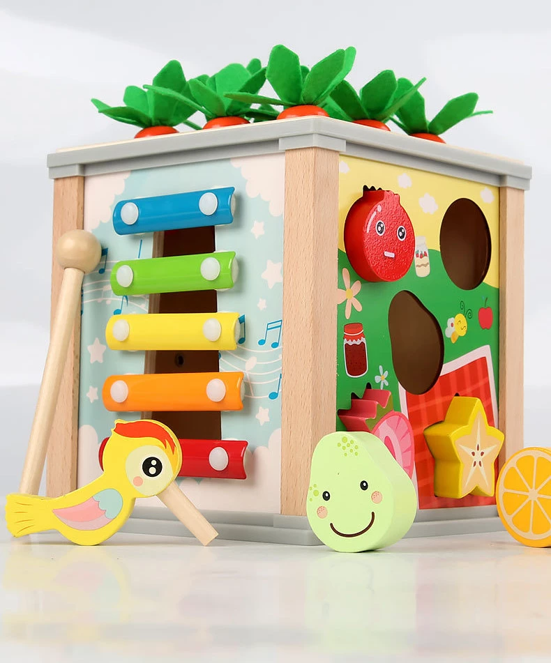 А еще кубик оснащен ксилофоном (в комплекте имеется специальный деревянный молоточек для игры на нем). Игры с ксилофоном будут способствовать развитию у ребенка музыкального слуха и чувство ритма.