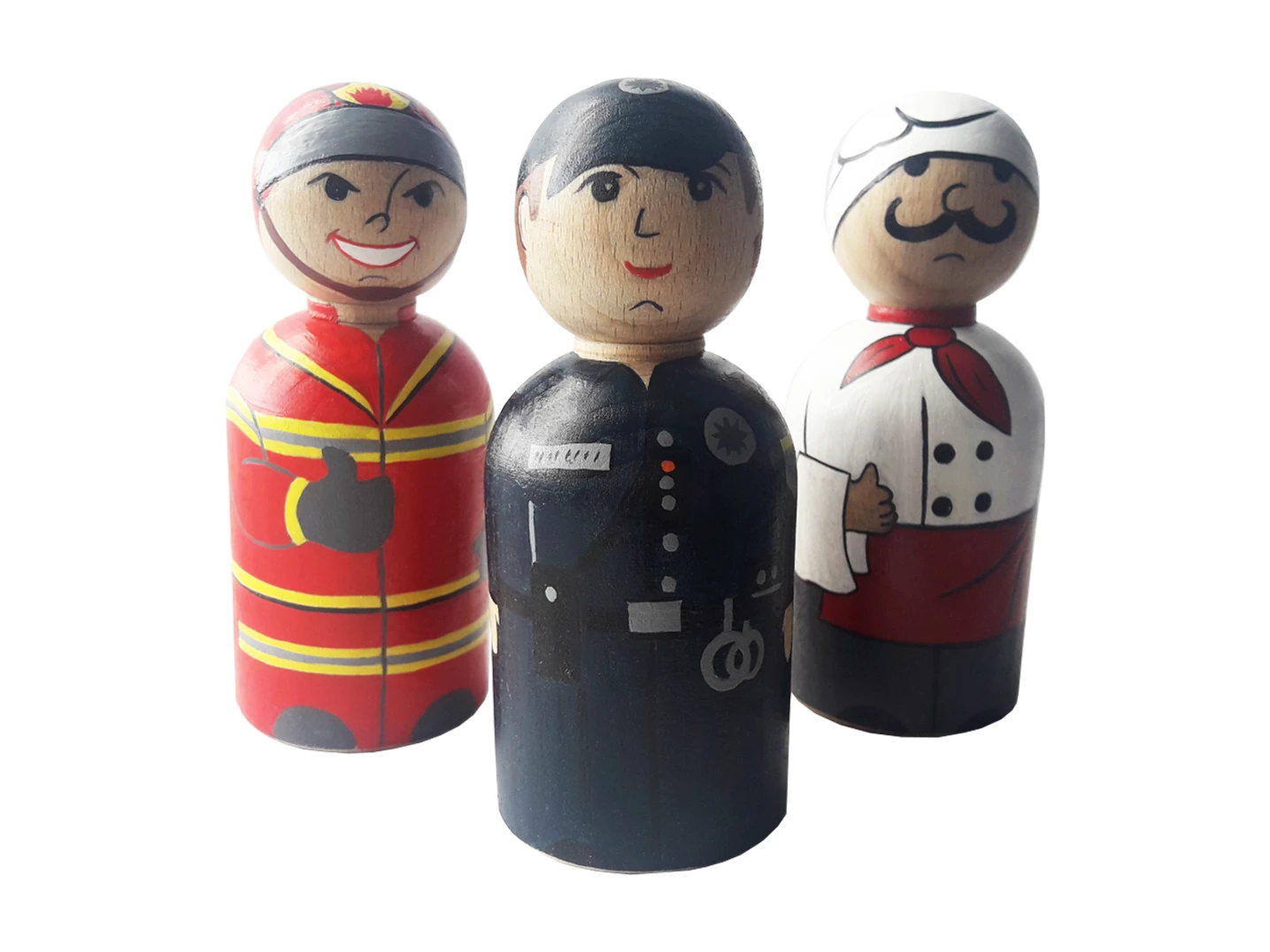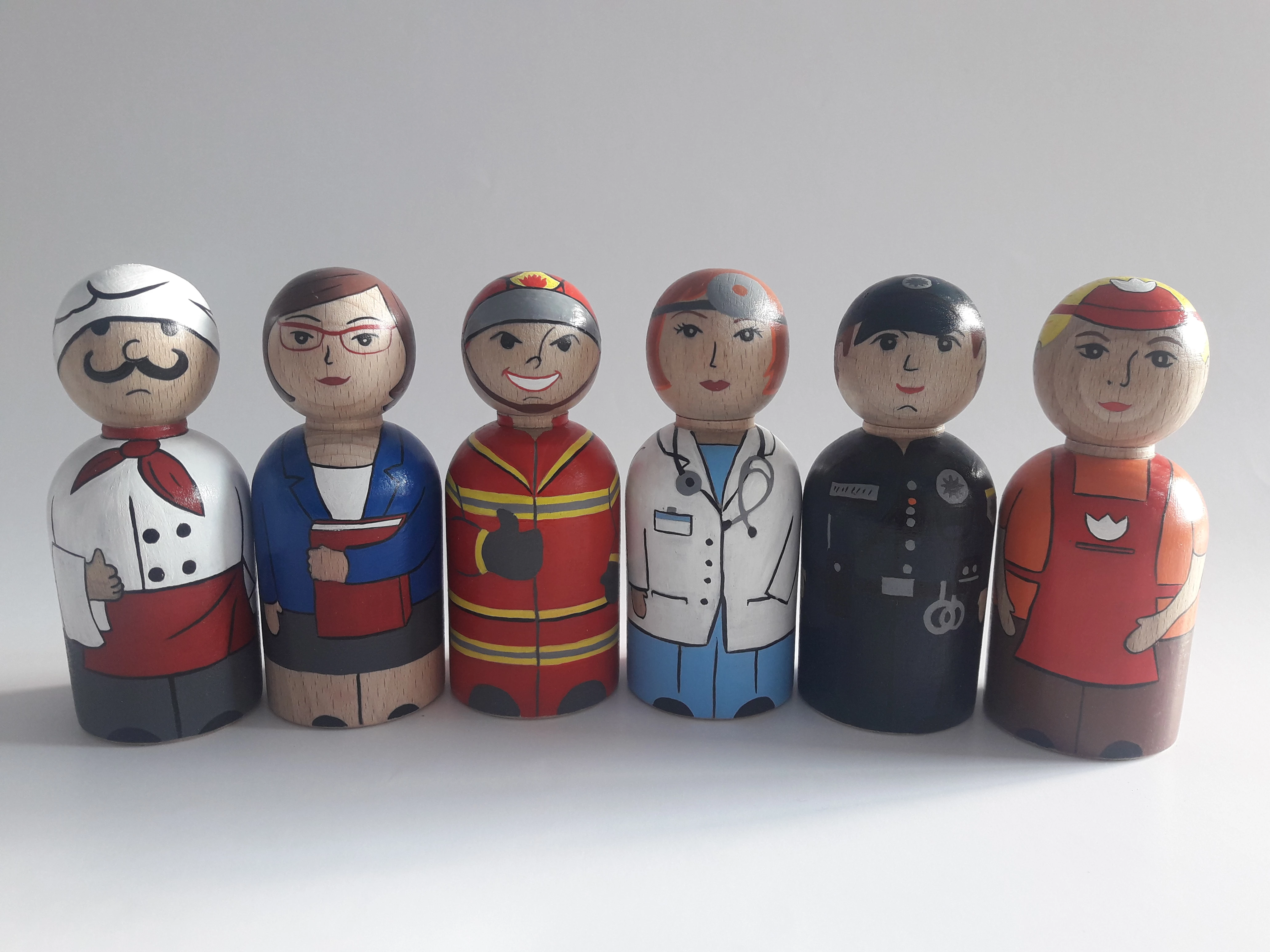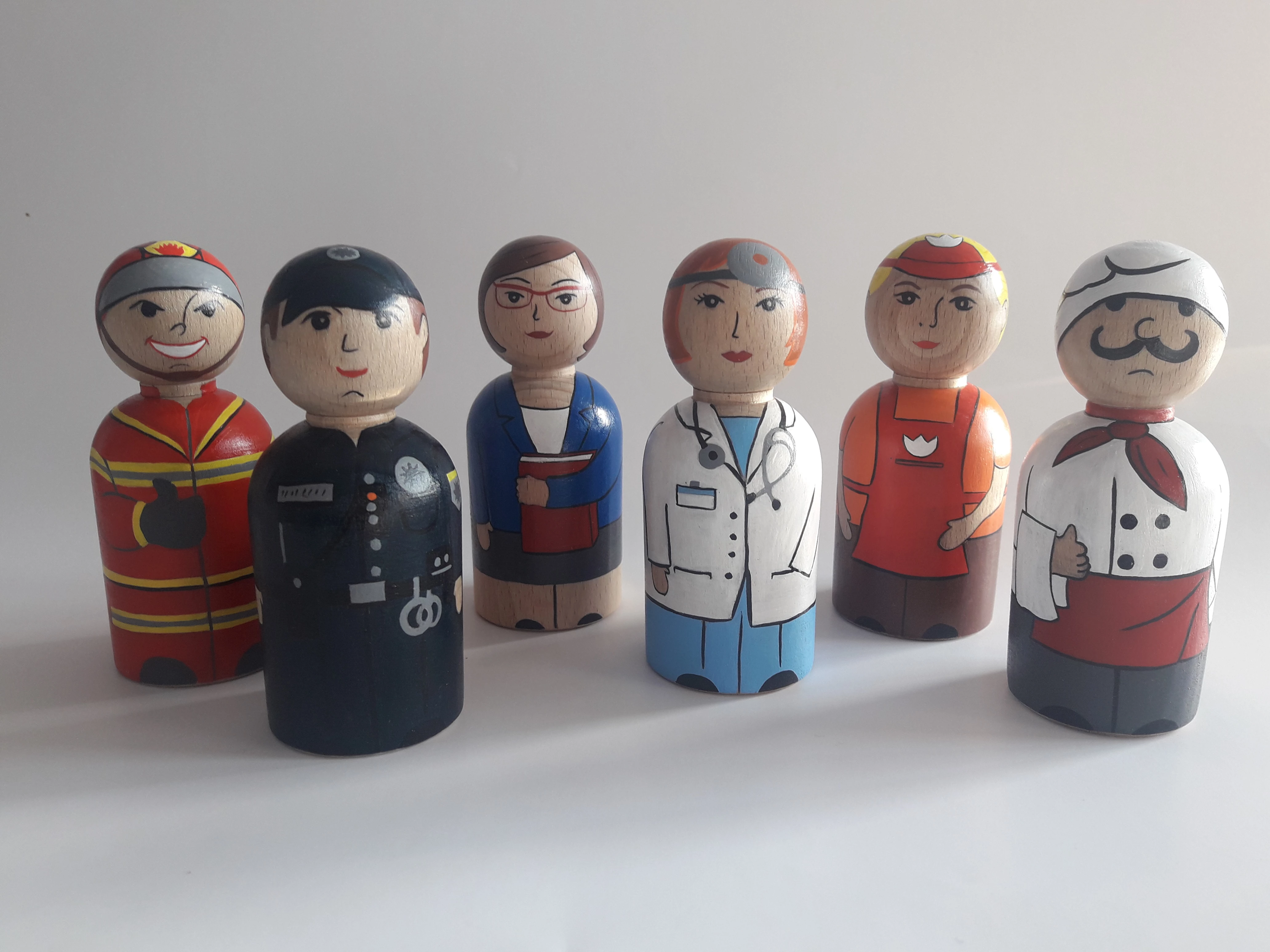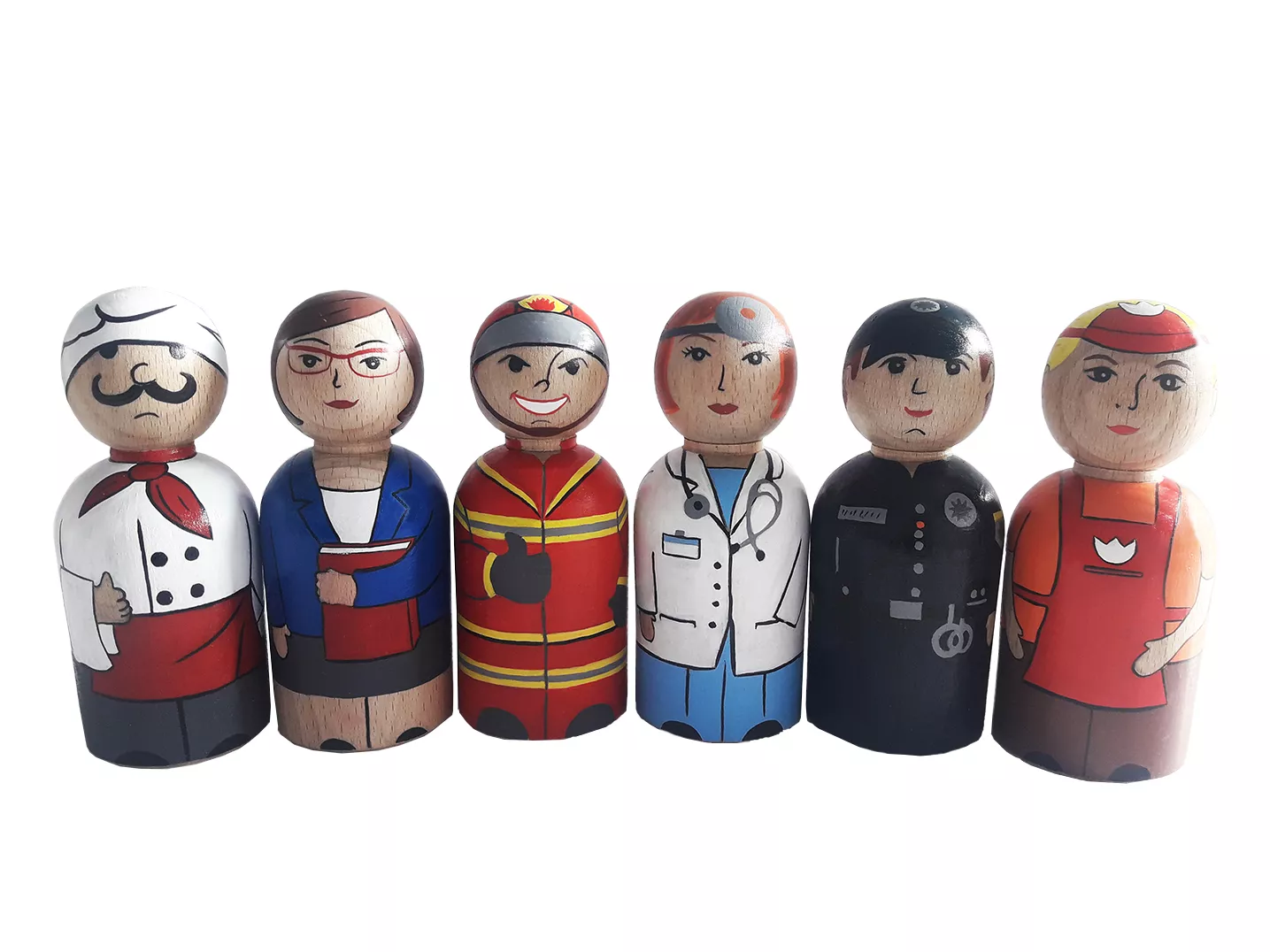 Данный набор фигурок от торговой марки Hega является хорошим демонстрационным материалом, знакомящим любознательных карапузов с разнообразными профессиями. Игровой комплект состоит из шести качественных деревянных фигурок, изображающих профессии учителя, стража порядка, пожарного, доктора, повара, а также продавца. Какая фигурка какую профессию олицетворяет, поможет определить ее одежда.