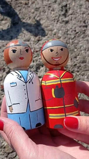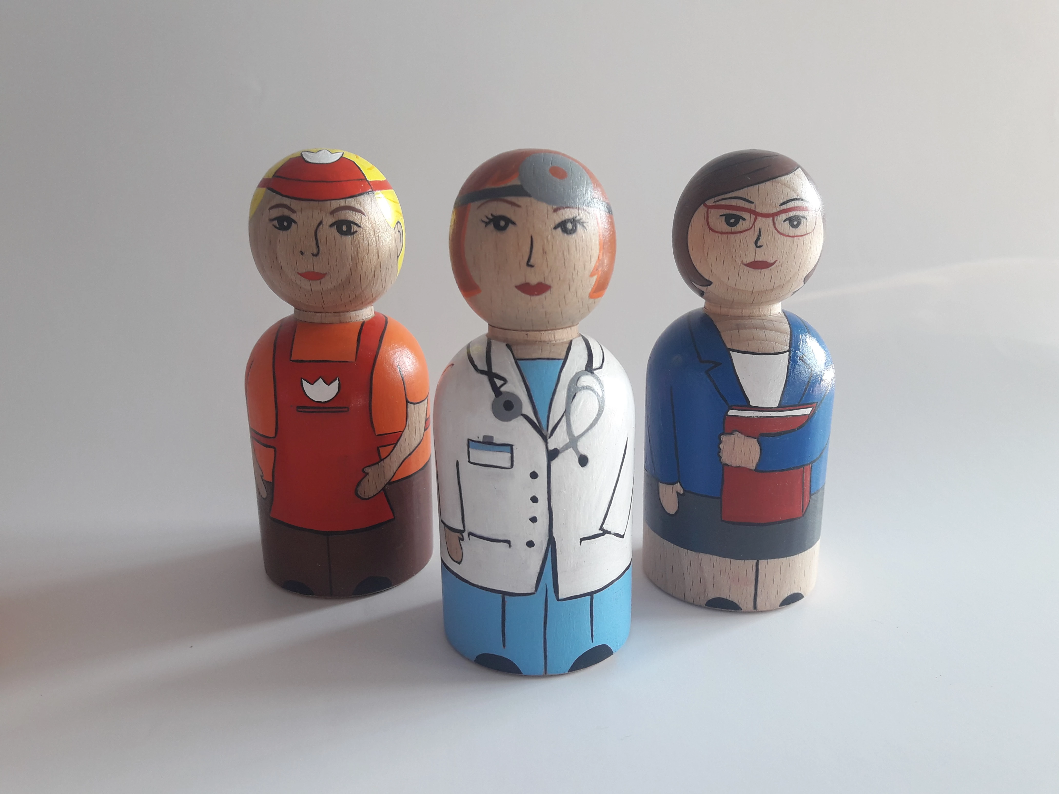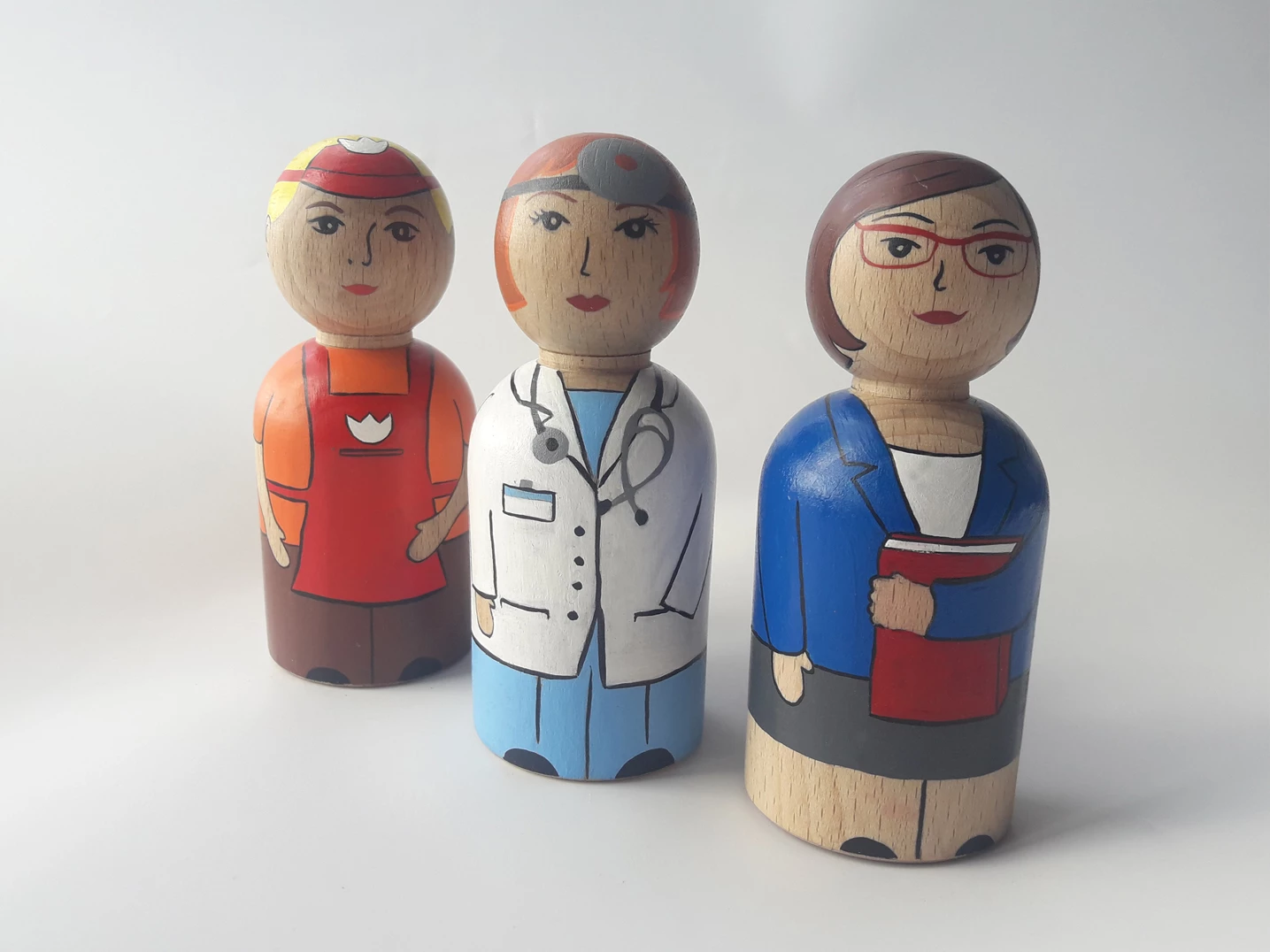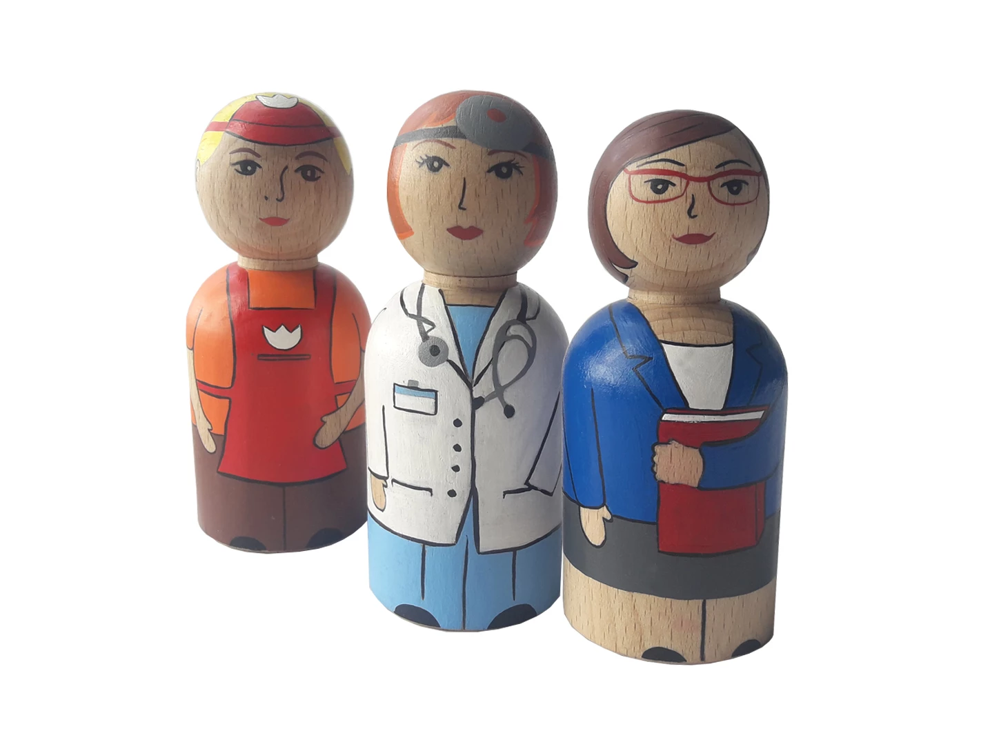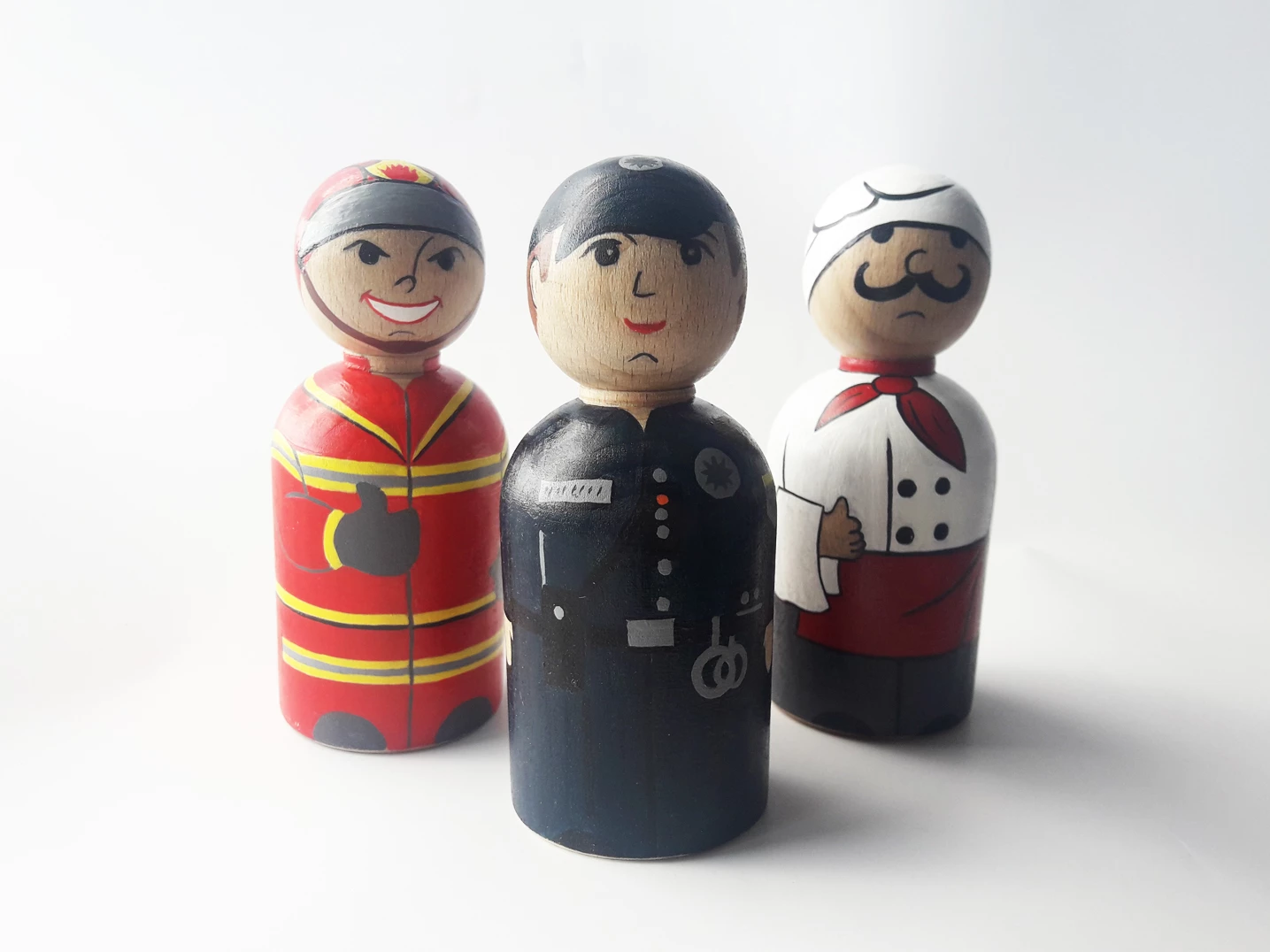 Данный набор фигурок от торговой марки Hega является хорошим демонстрационным материалом, знакомящим любознательных карапузов с разнообразными профессиями. Игровой комплект состоит из шести качественных деревянных фигурок, изображающих профессии учителя, стража порядка, пожарного, доктора, повара, а также продавца. Какая фигурка какую профессию олицетворяет, поможет определить ее одежда.