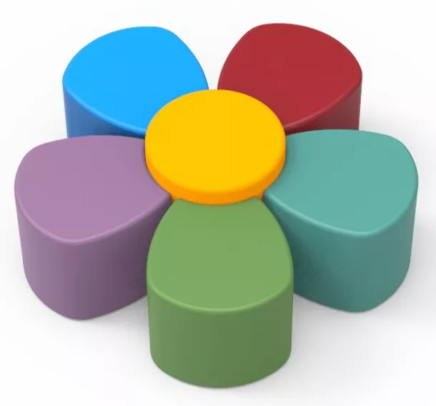 Детские пуфики - прекрасное дополнение интерьера в детской комнате и многофункциональный предмет. Пуф состоит из 6-ти частей: центральный круг и 5 разноцветных лепестков.