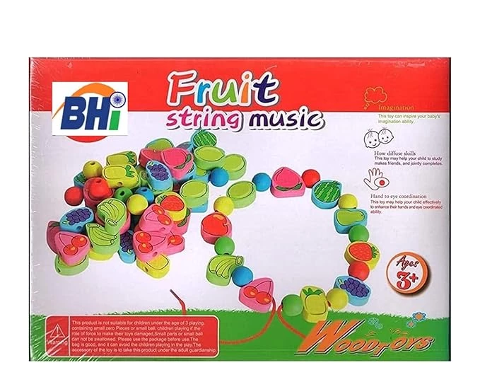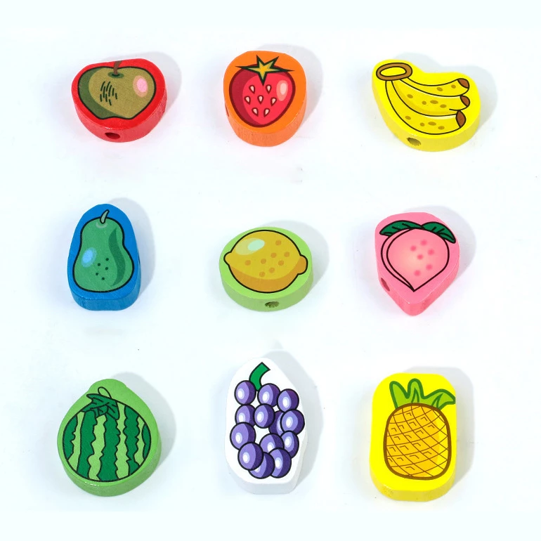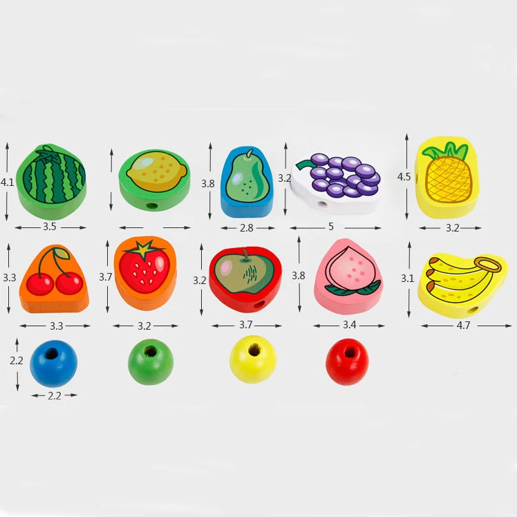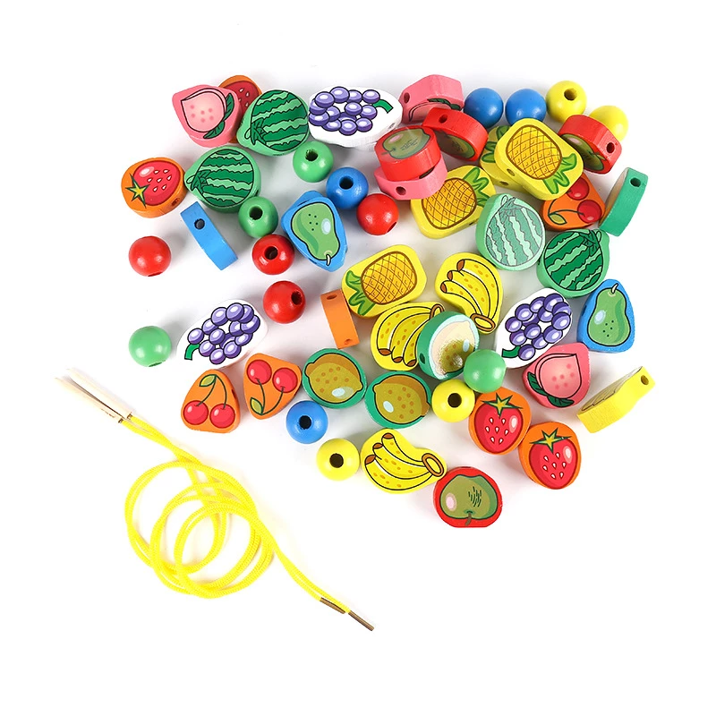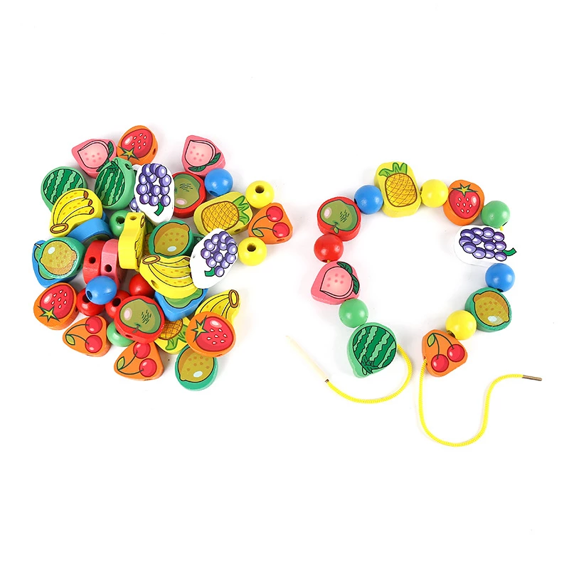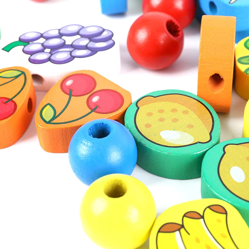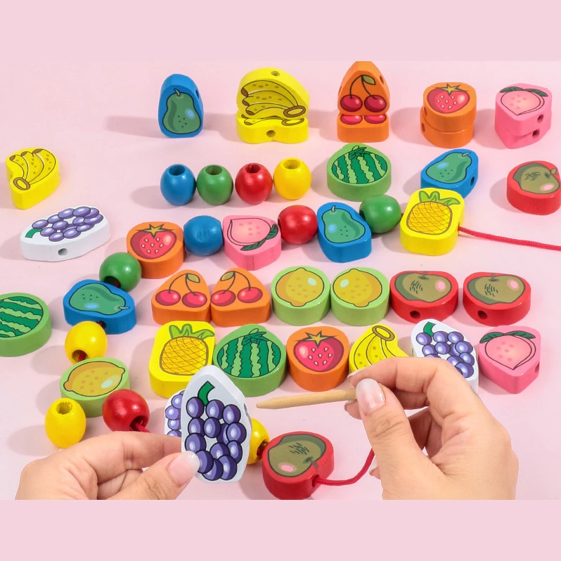 Это отличная развивающая игрушка для малышей. Деревянные фигурки фруктов дети могут нанизывать на шнурок из набора. Можно придумывать массу разных комбинаций. Например, нанизать все морковки или свеклы. Или 2 баклажана и 5 тыкв. Все зависит от вашей фантазии.