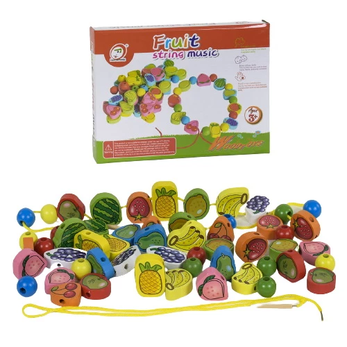 Это очень интересный развивающий набор поможет потренировать мелкую моторику и развить творческий потенциал ребенка. Разноцветные бусинки необходимо нанизывать на шнуровку, комбинируя цвета и дизайны. Полученные украшения можно носить или подарить своим друзьям. Все материалы очень качественные, поскольку используется натуральное дерево и гипоаллергенная краска. Бусинки имеют различные формы, тематика набора - овощи.