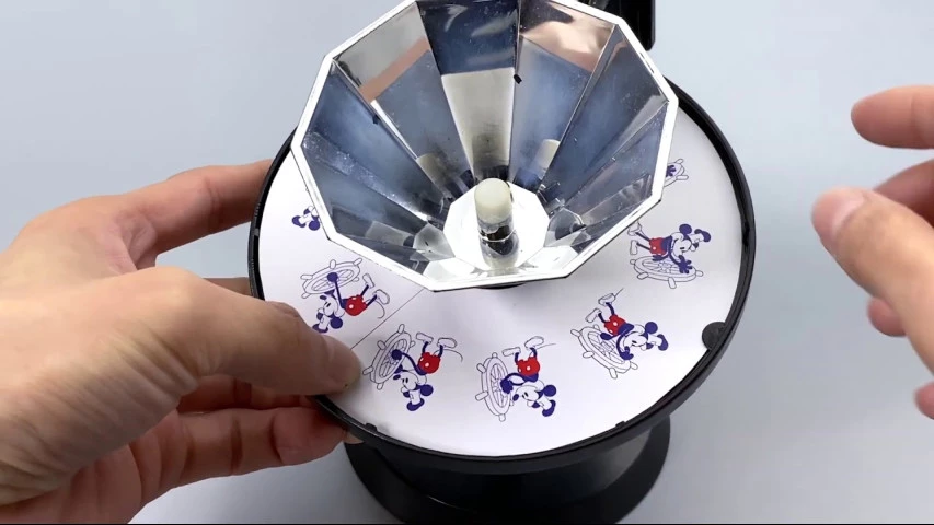 После сборки проектора, вложите диски с изображением Микки Мауса. Крутите прибор и смотрите в рамку, фигурка персонажа "оживет".